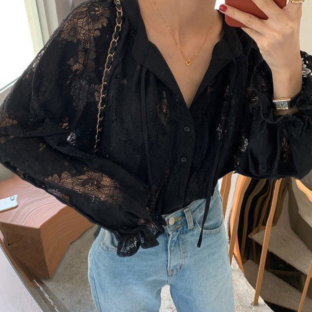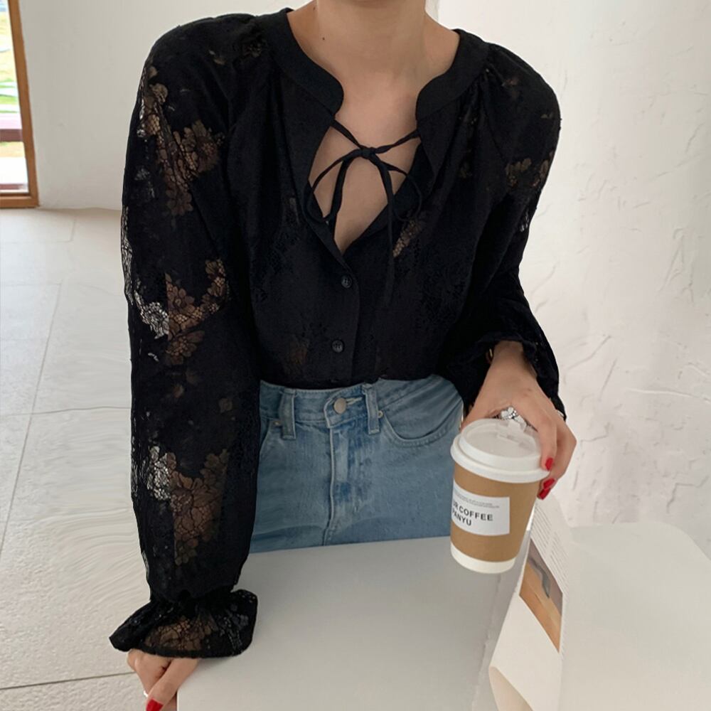 フリル袖ブラウス黒 レーストップス春秋 透かしレースシャツ