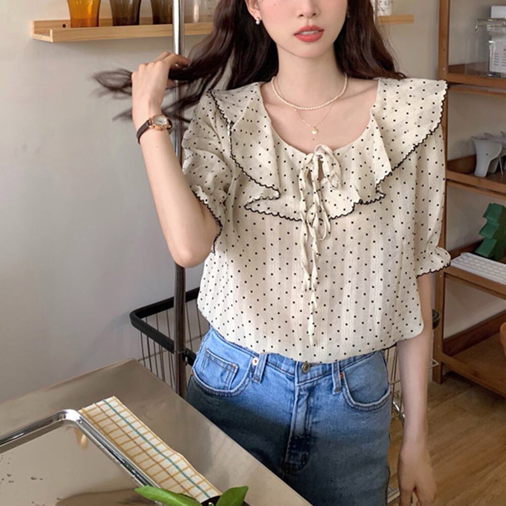 大人可愛い 水玉柄 シャツブラウス ビックカラー トップス 袖フリル おしゃれ カジュアル フリルカラーブラウス レトロ