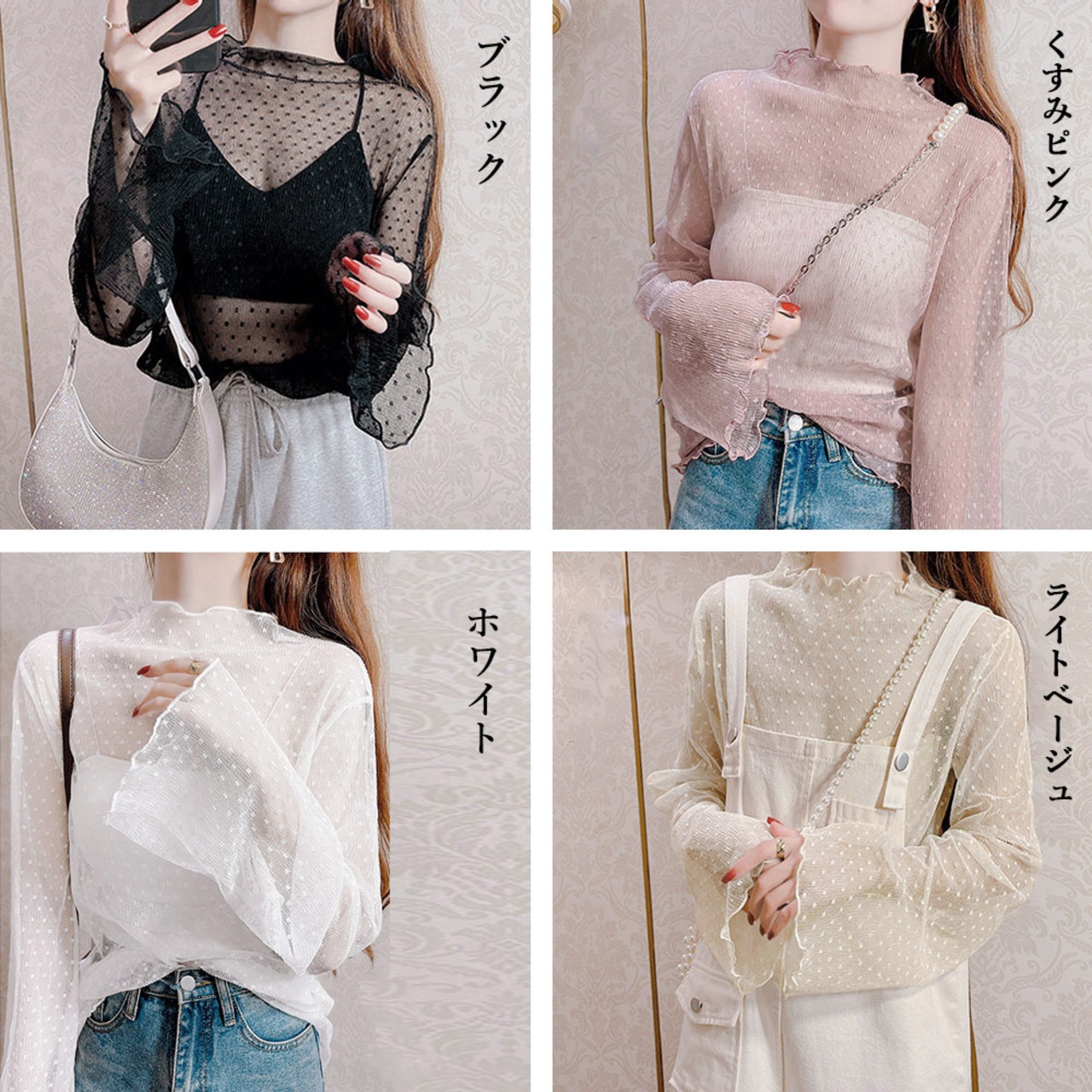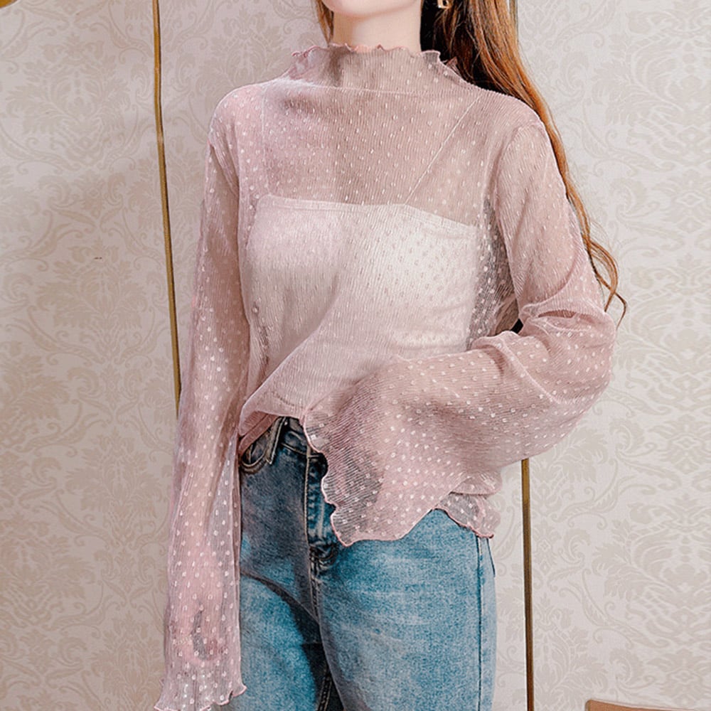 シアートップス チュールレース 重ね着 ドット柄シースルーブラウス インナー 可愛い 韓国風 レイヤード カジュアル 春