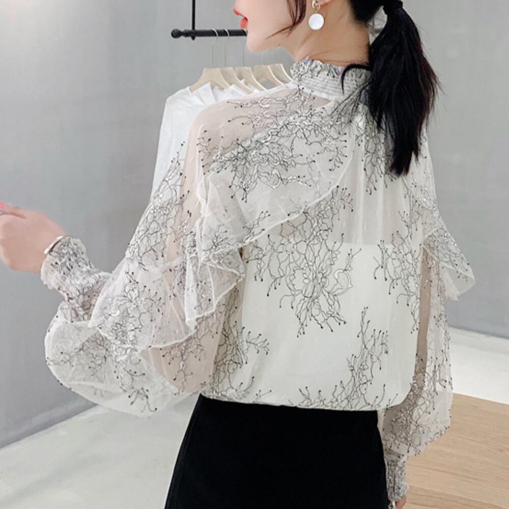 フリル フレアトップス 透け感 肌見せ 大人可愛い花柄ブラウス ハイネック ぽわん袖春夏長袖 薄手ブラウス 韓国おしゃれ