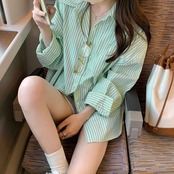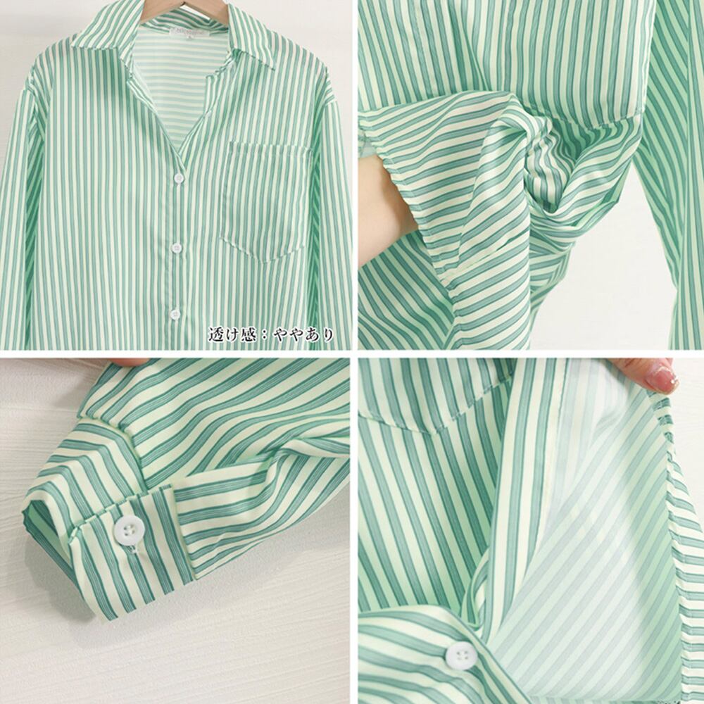 レディース グリーンストライプシャツ カジュアル 長袖シャツ 韓国 春夏 シャツカーディガン 薄手 おしゃれ ストリート