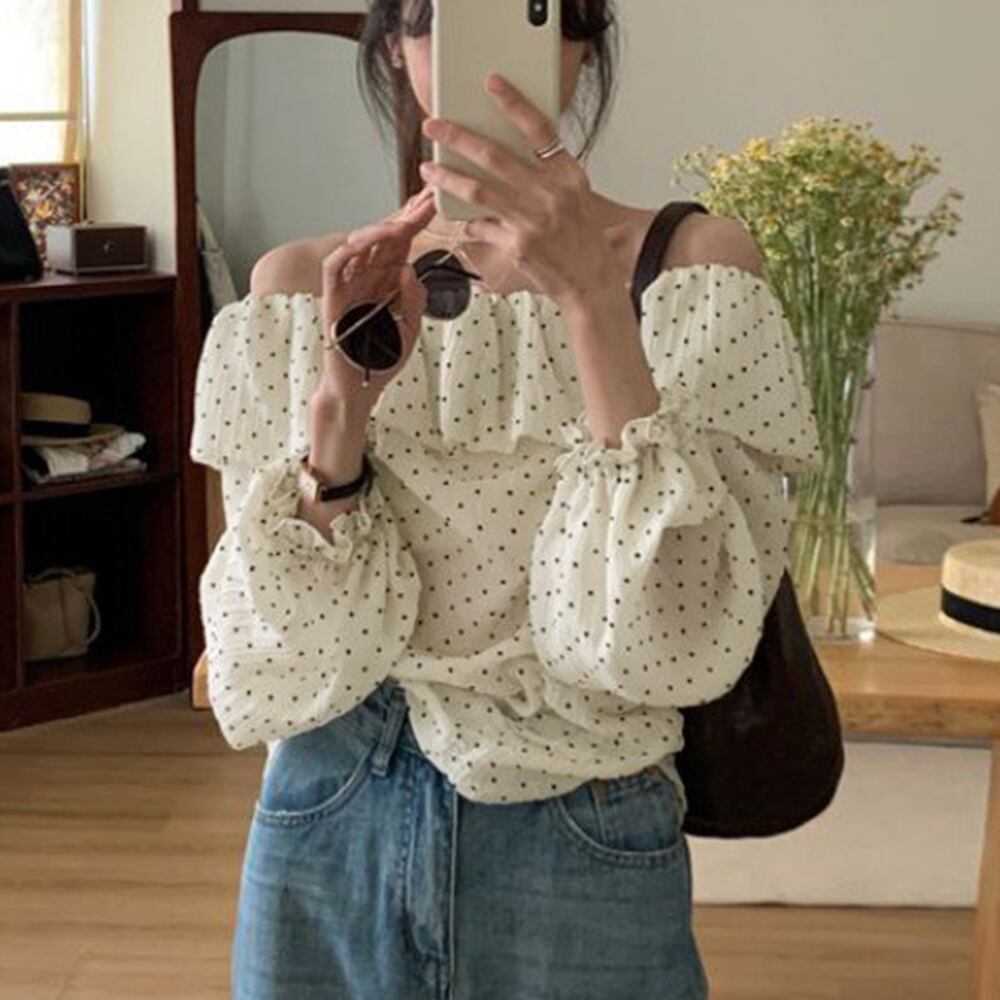 おしゃれ 長袖 フリルトップス ドット柄 水玉模様 大人可愛いブラウス きれいめ夏服 肩出しカットソー 韓国ファッション