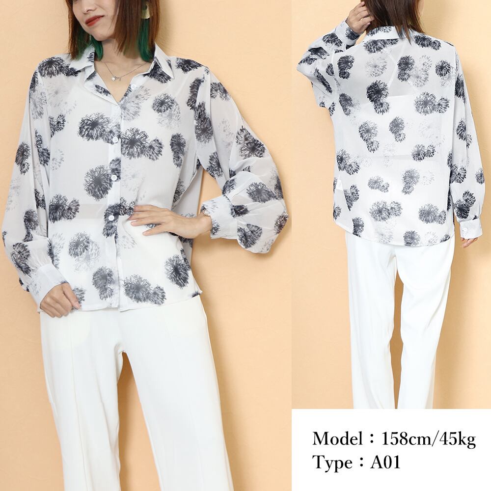 上品な花柄のプリントがシアーな生地に映え、エレガントさを際立たせるシアーシャツです