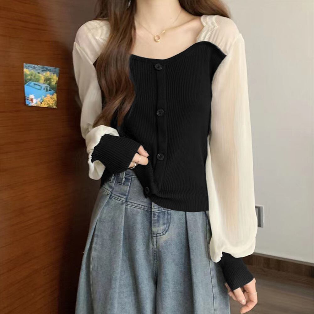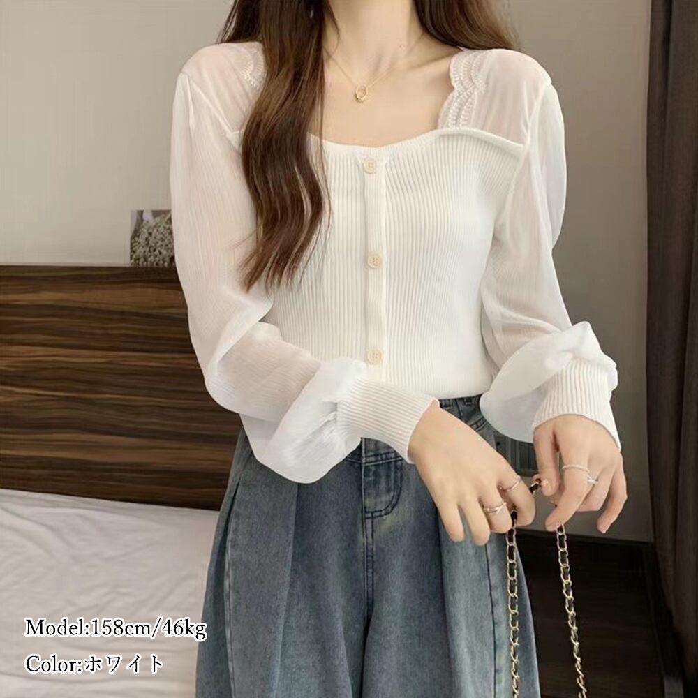 レディース フェミニン感ブラウス 袖透け感 スクエアネック ドッキングニット フロントボタン飾り 大人カジュアルニット