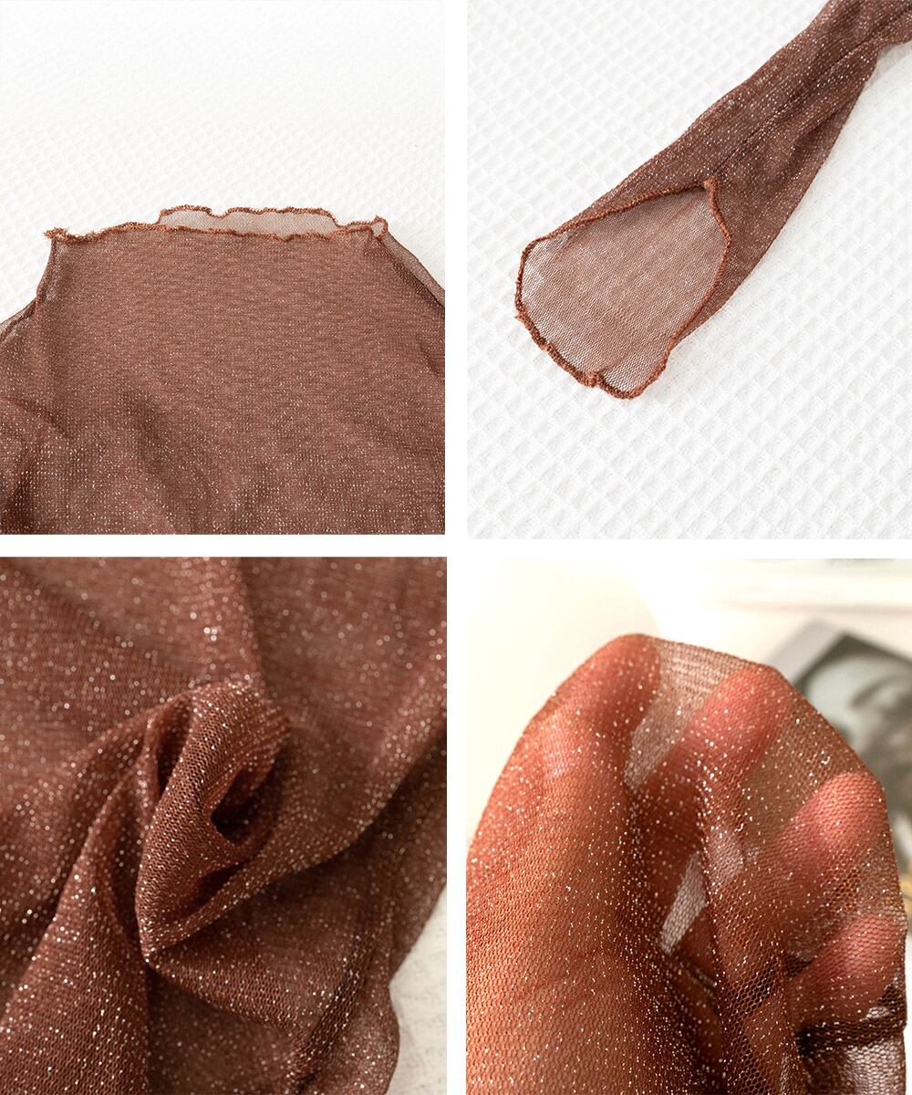 ラメ感のあるデザインでコーディネートを華やかに仕上げるシースルートップス