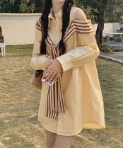 ストライプショール付き&オフショルダーデザインで、いつものシャツコーデとは一味違うスタイリング、オシャレ感アップ