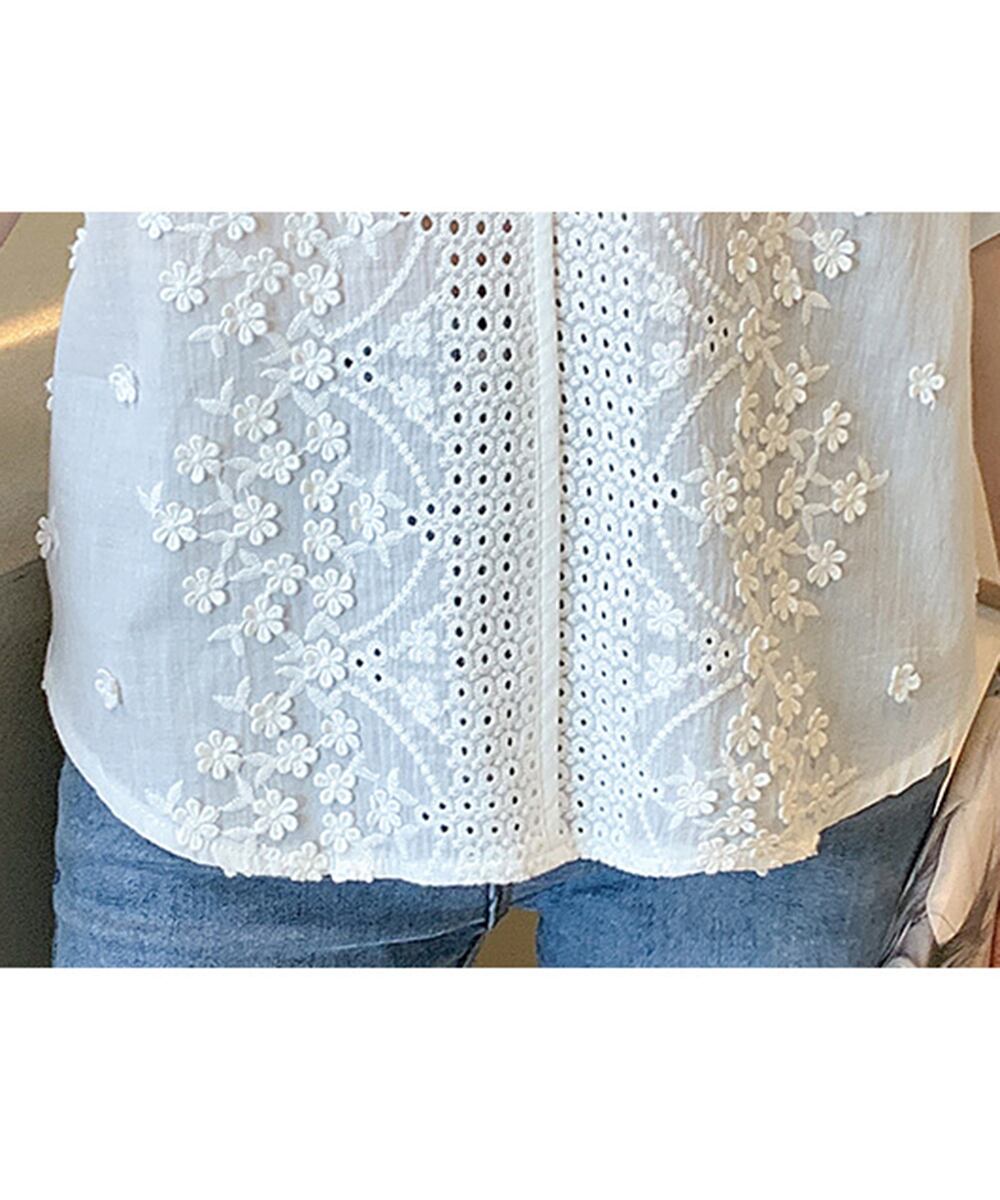 キーネックデザインでデコルテをキレイに見せてくれる花柄刺しゅうブラウス