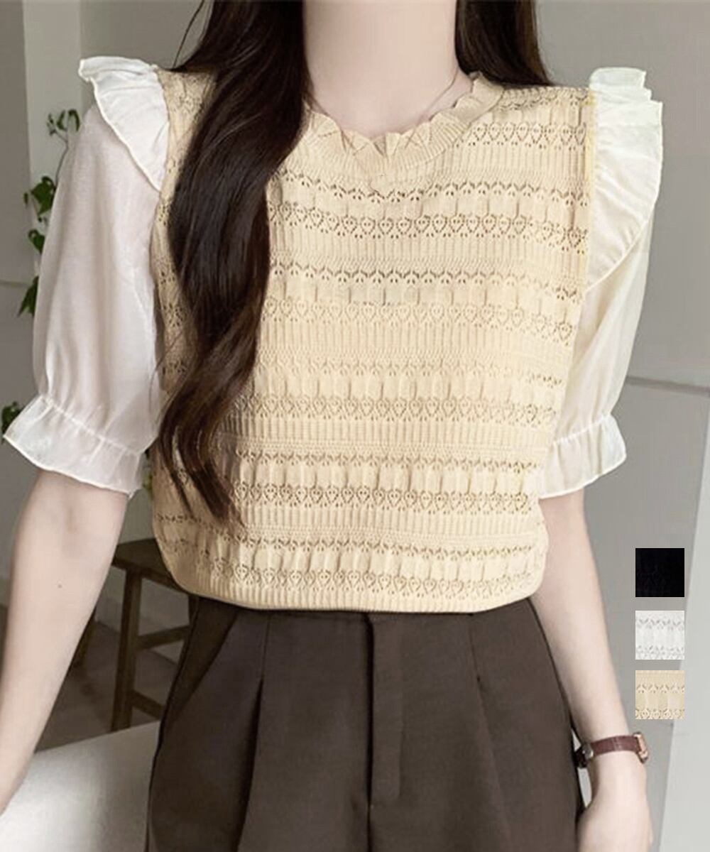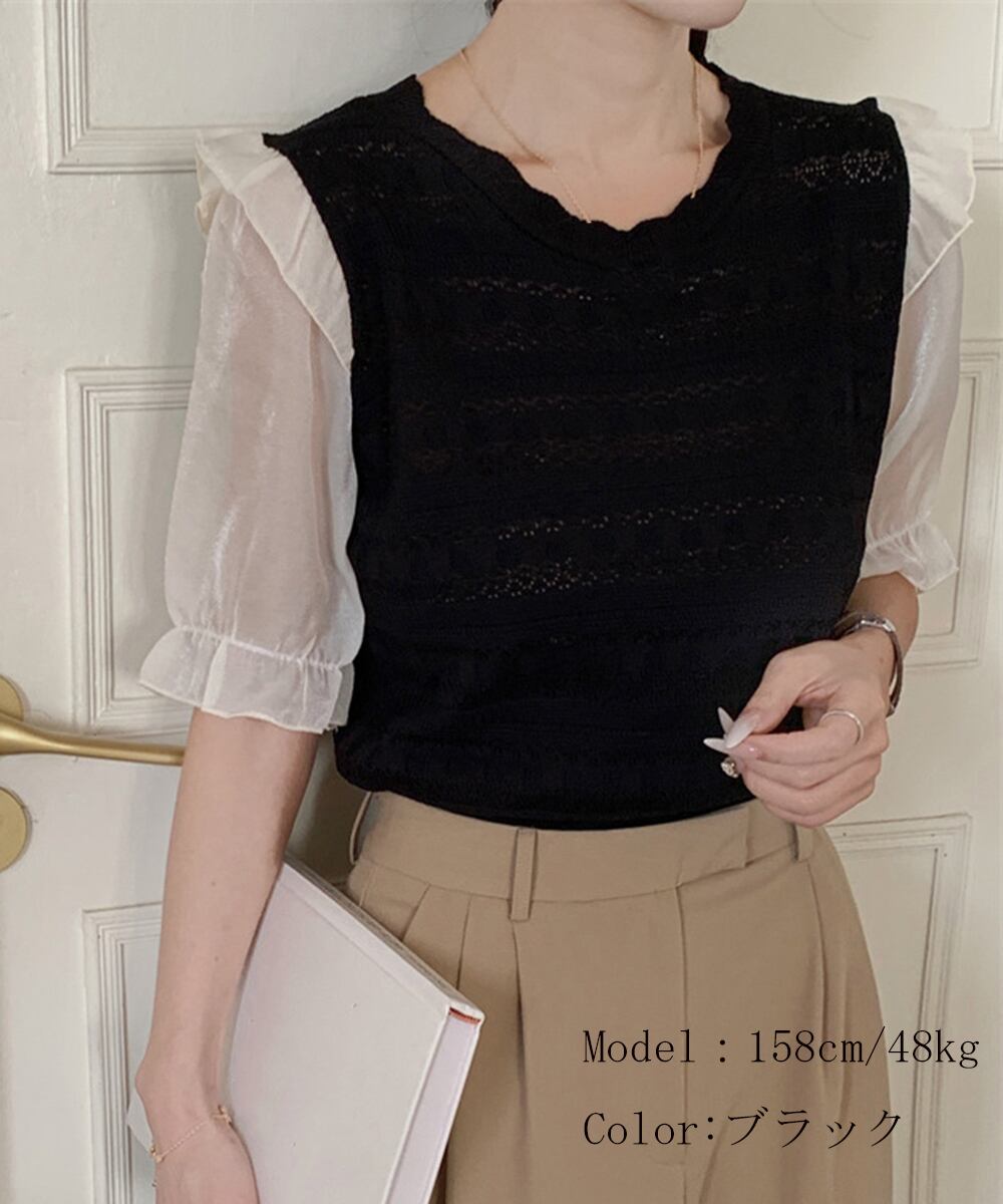 半袖 ニットトップス クールネック プルオーバー 春夏 フェミニン ニットブラウス 袖切り替え 透け感 韓国風 きれいめ