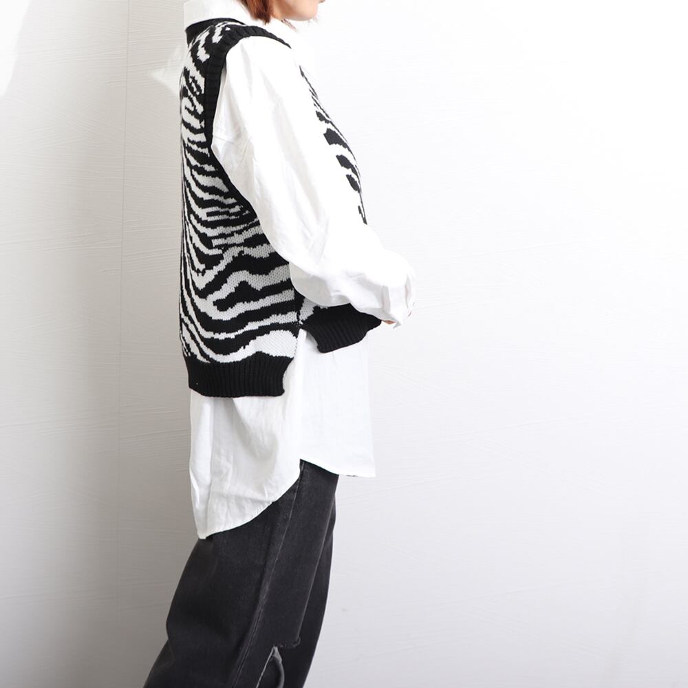 すっきり見えるVネックとゆとりのある身頃デザインのシマウマ柄ニットベスト