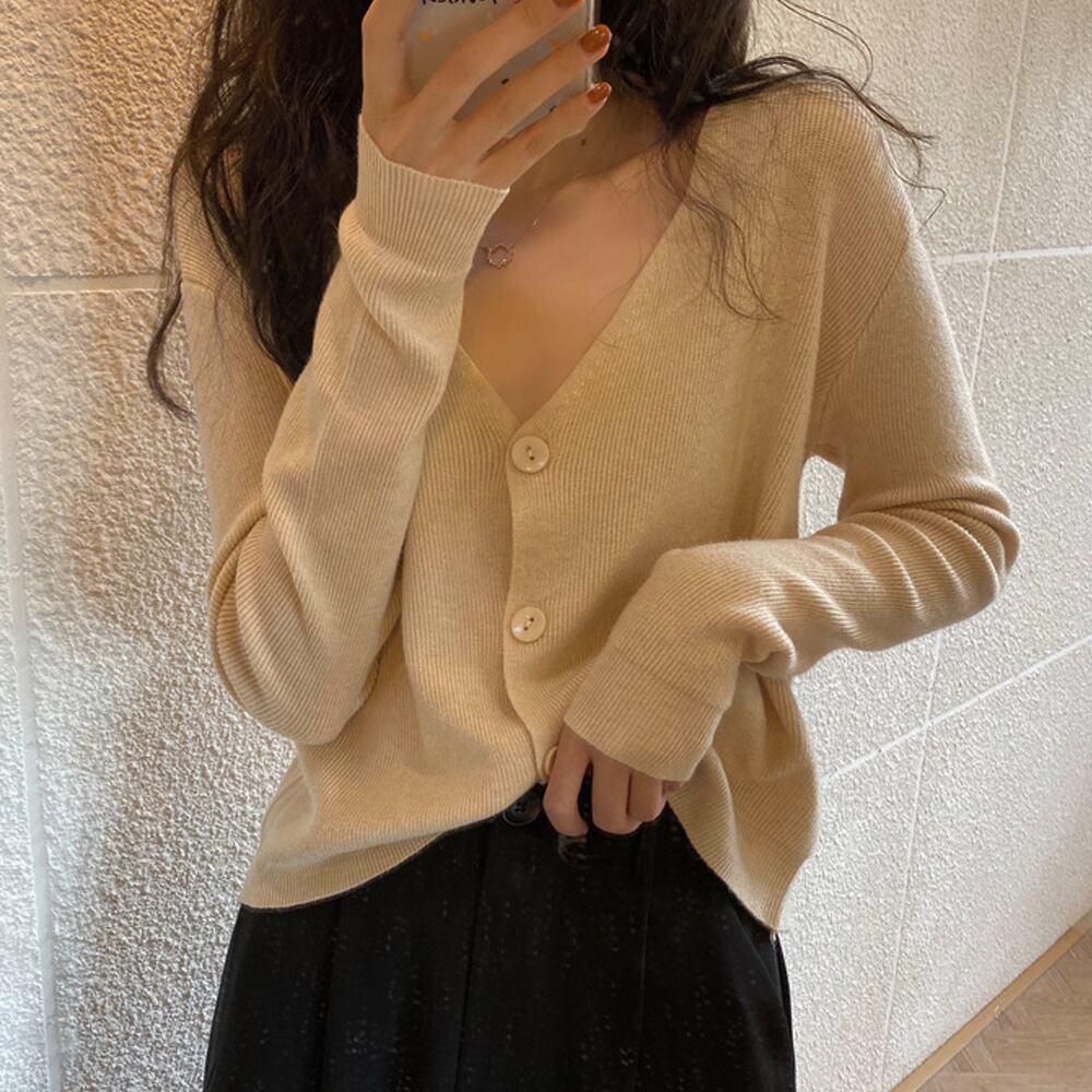 Vネック ニットカーディガン レディース リブ編み ショート丈 羽織
