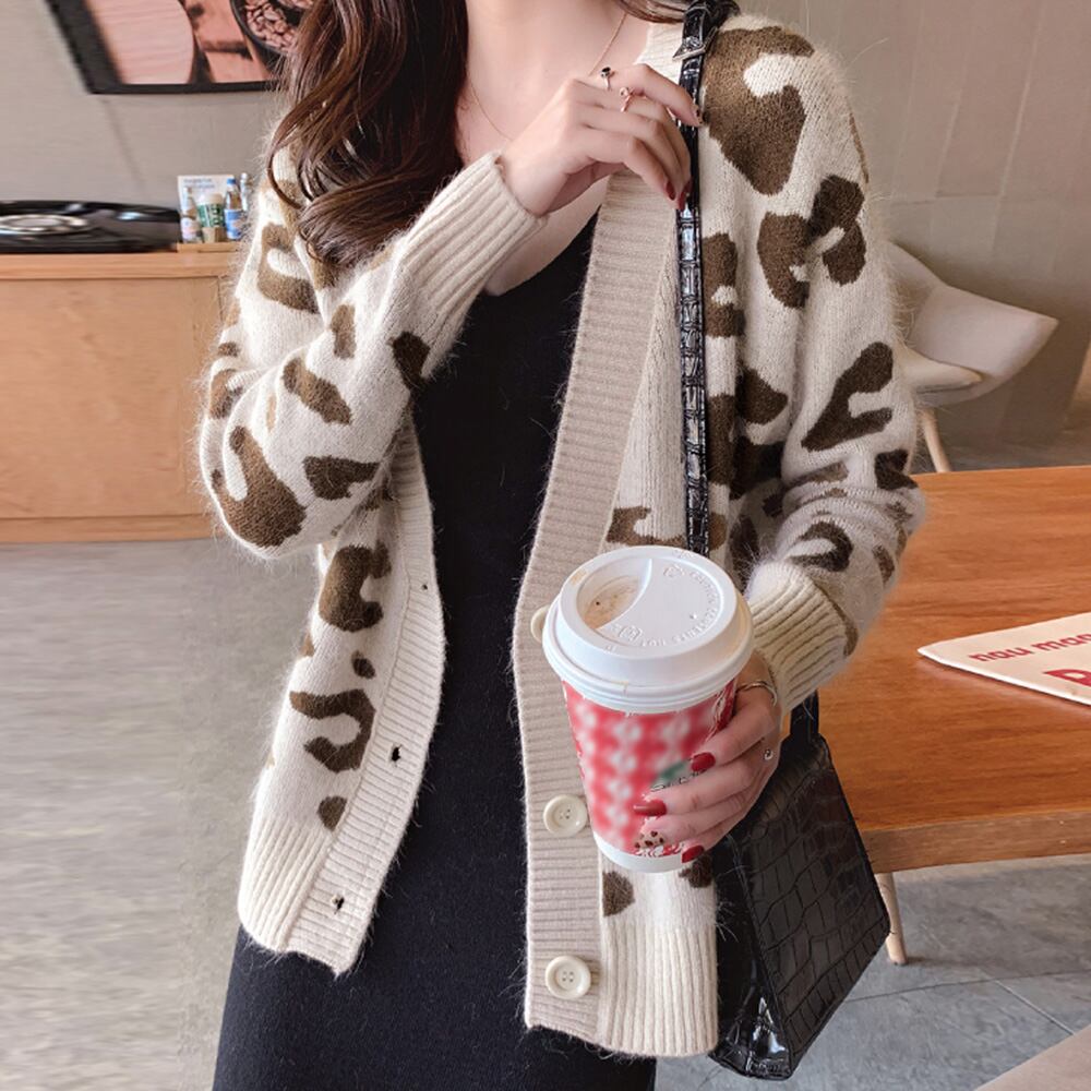可愛いヒョウ柄デザインがおしゃれなレディースニットカーディガンです。