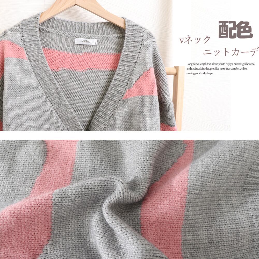 マルチボーダー ニットトップス 長袖 配色 ニットカーデ ゆったりvネック 体型カバー ニット ライトアウター