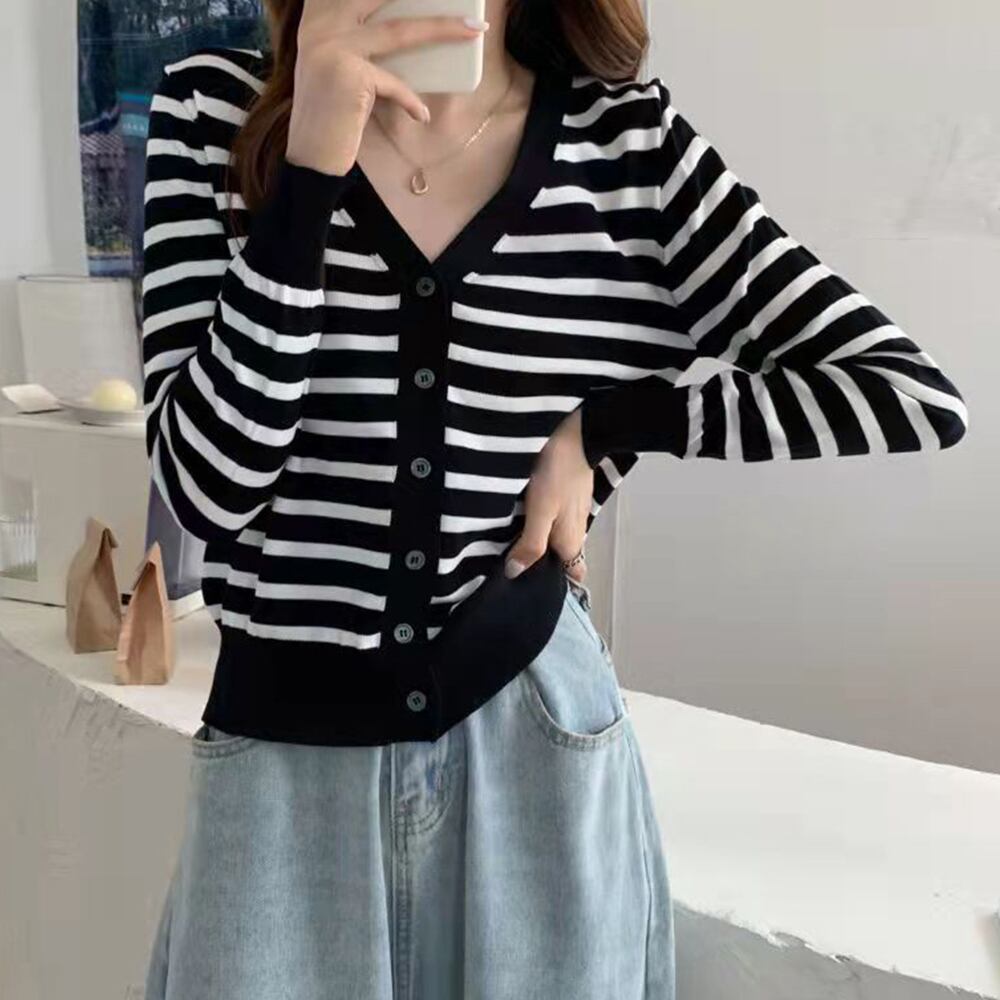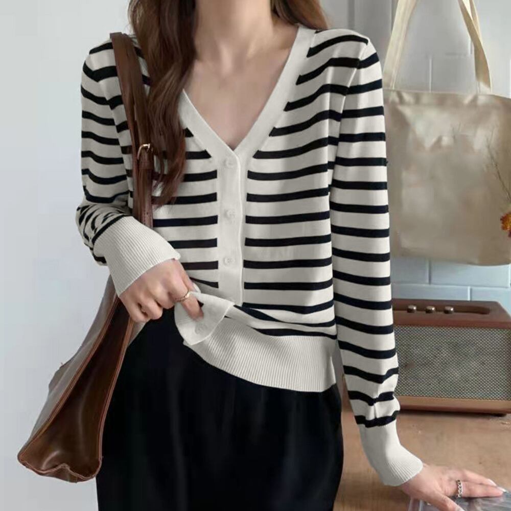 春秋ファッションに欠かせなくレディースボタン付きボーダー柄のニットカーディガン