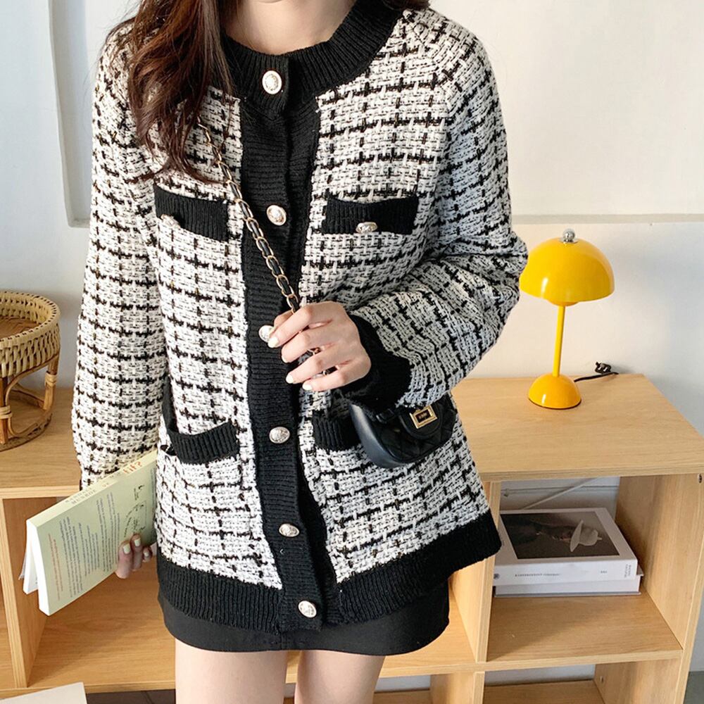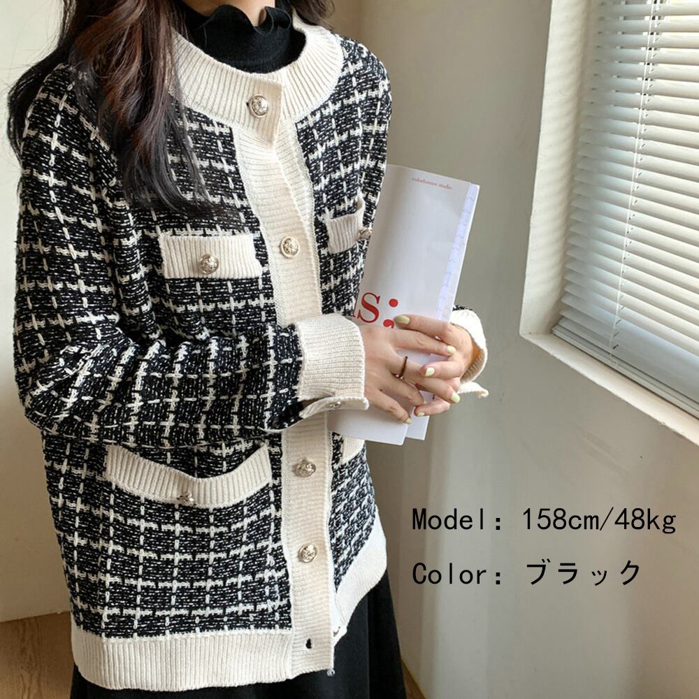 レディース ニットトップス 配色 ニットセーター ゆったり ボタン付き お洒落 チェック柄 ニットアウター ニットコート