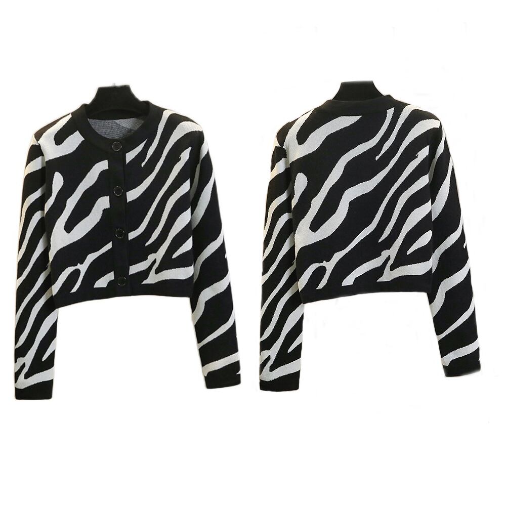 春秋ファッションに欠かせないレディースボタン付きゼブラ柄のニットカーディガン