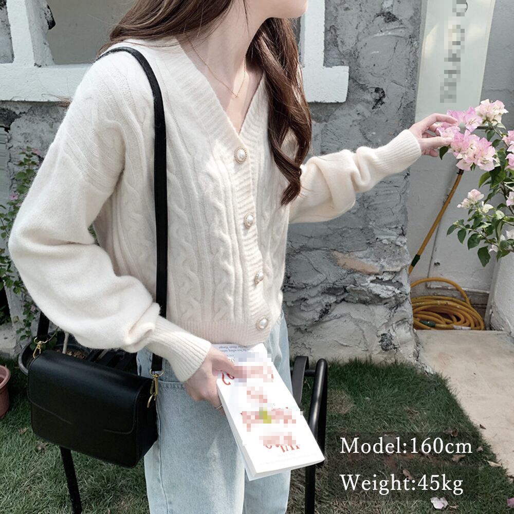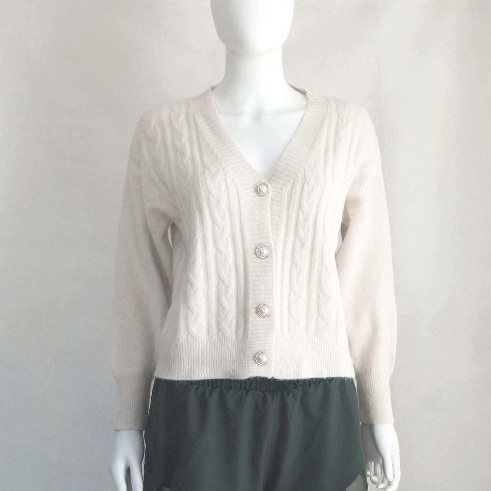 ショート丈 ニットトップス パールボタン 前開き ニットソー ケーブル編み 着やせ
