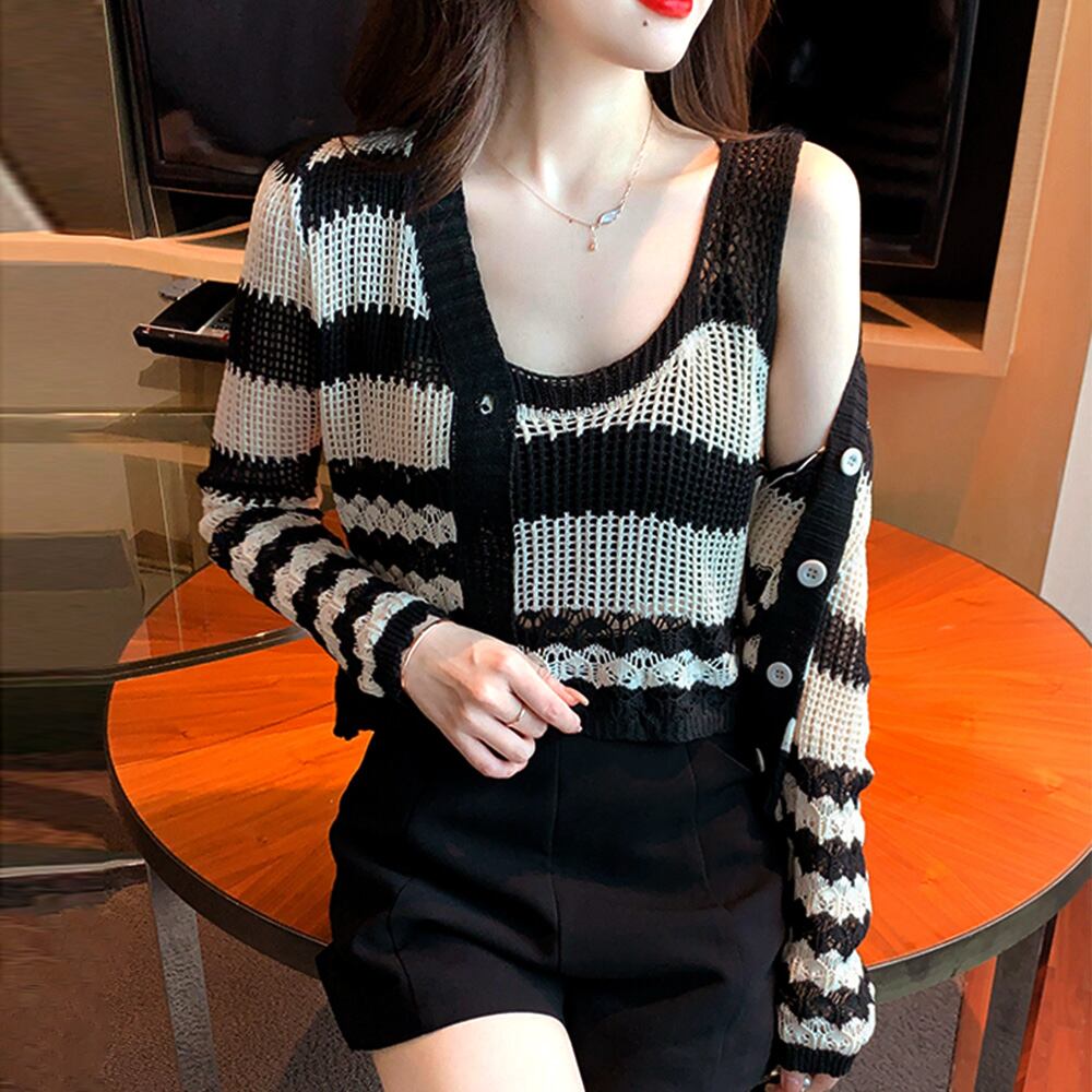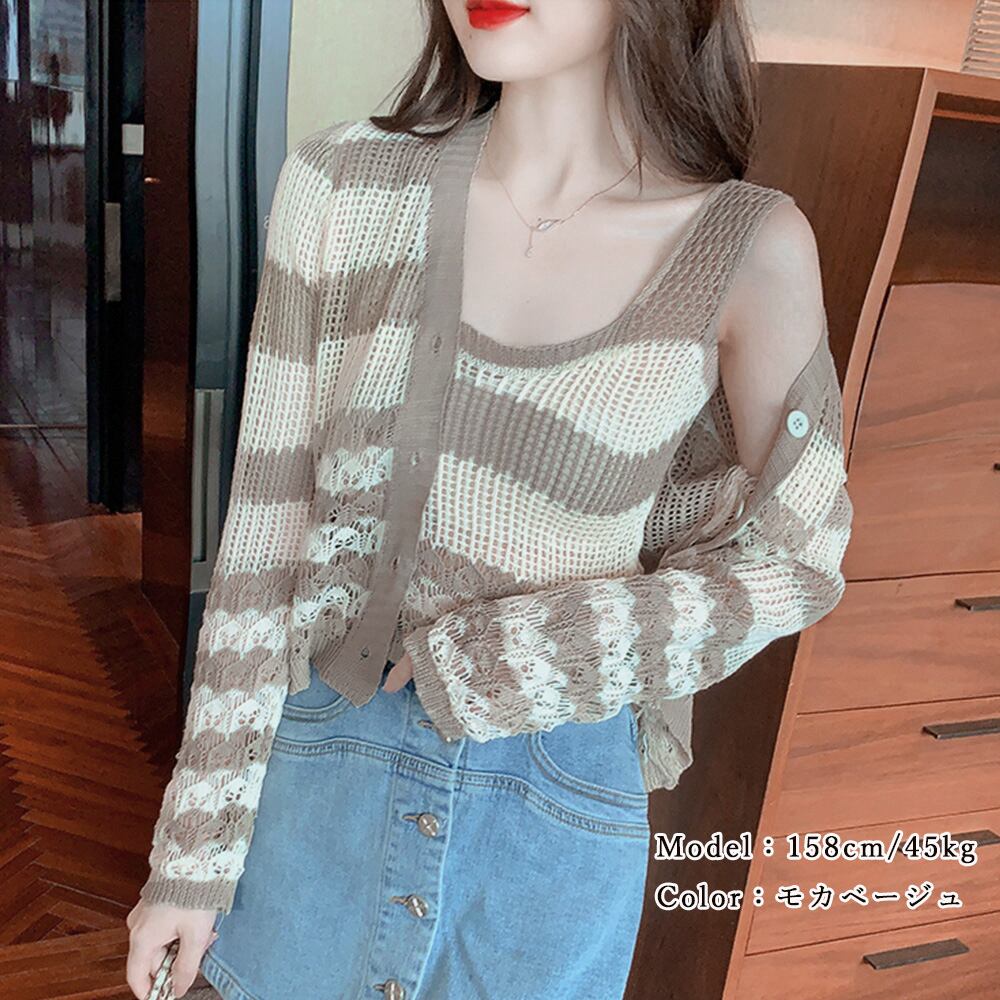 レディース ボーダー柄 ショート丈トップス 透かし編み 前開き秋服 アンサンブル 長袖ニットソー 女性カジュアル 韓国風