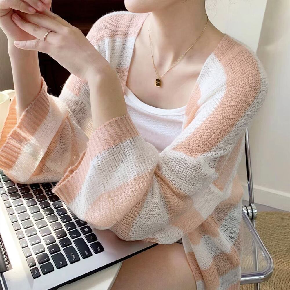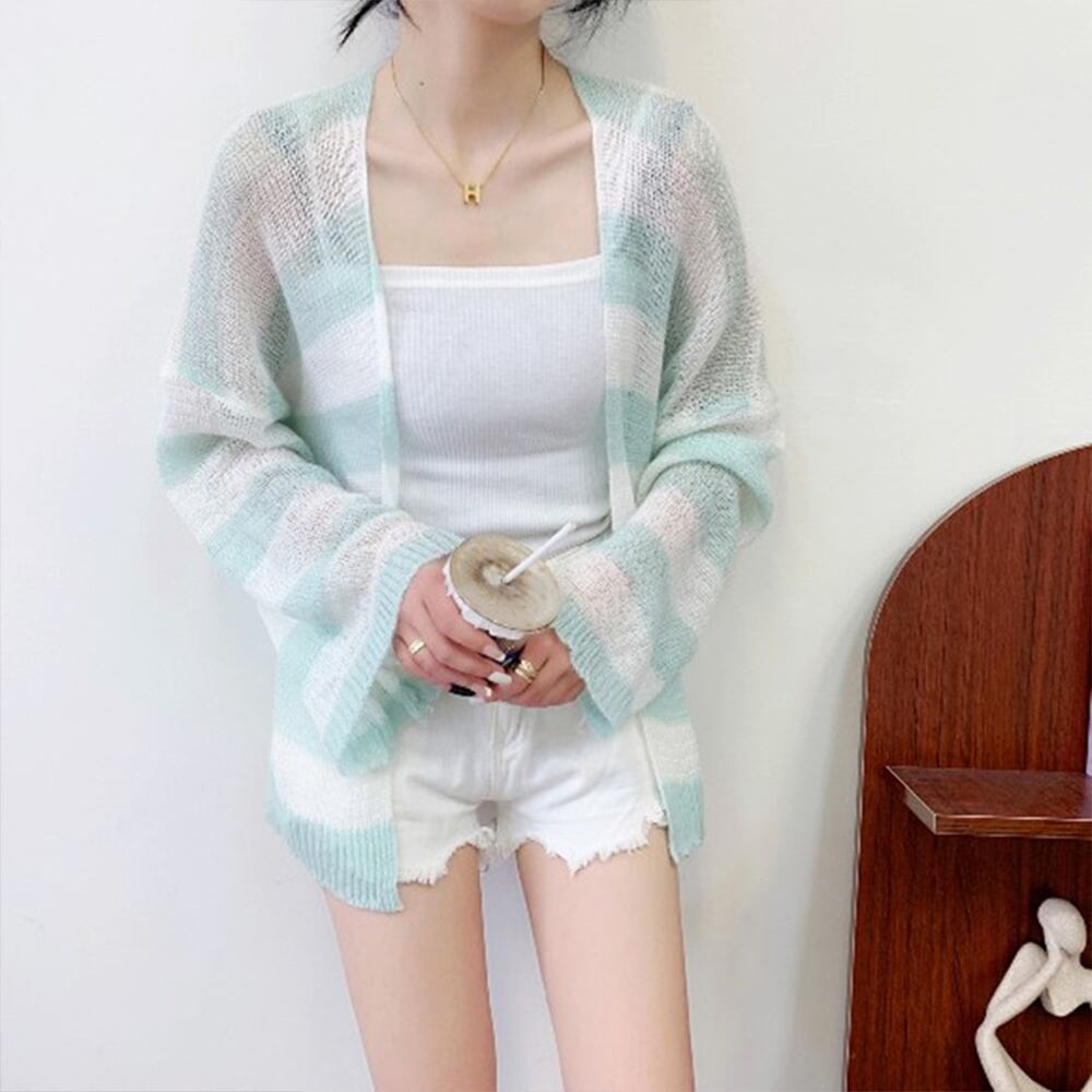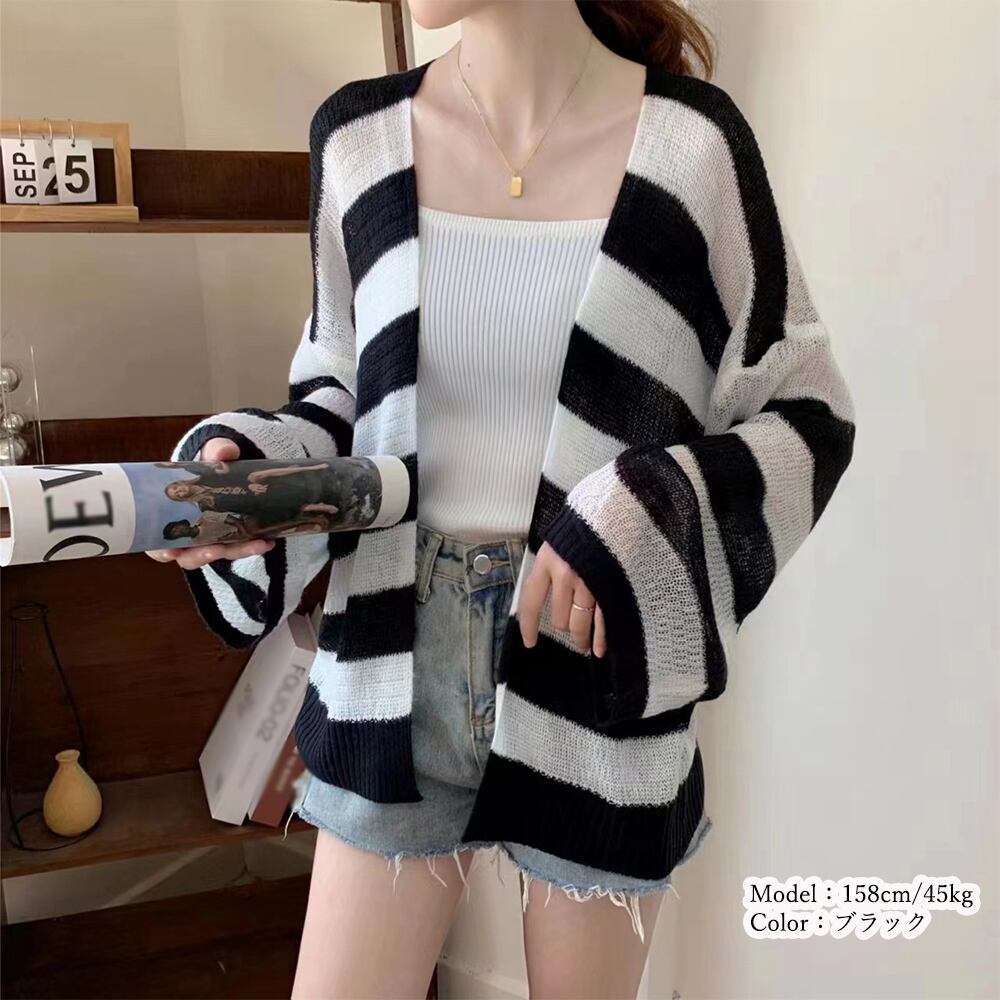 レトロ感が溢れている、おしゃれな透かし編みボーダー柄サマーニットカーディガン