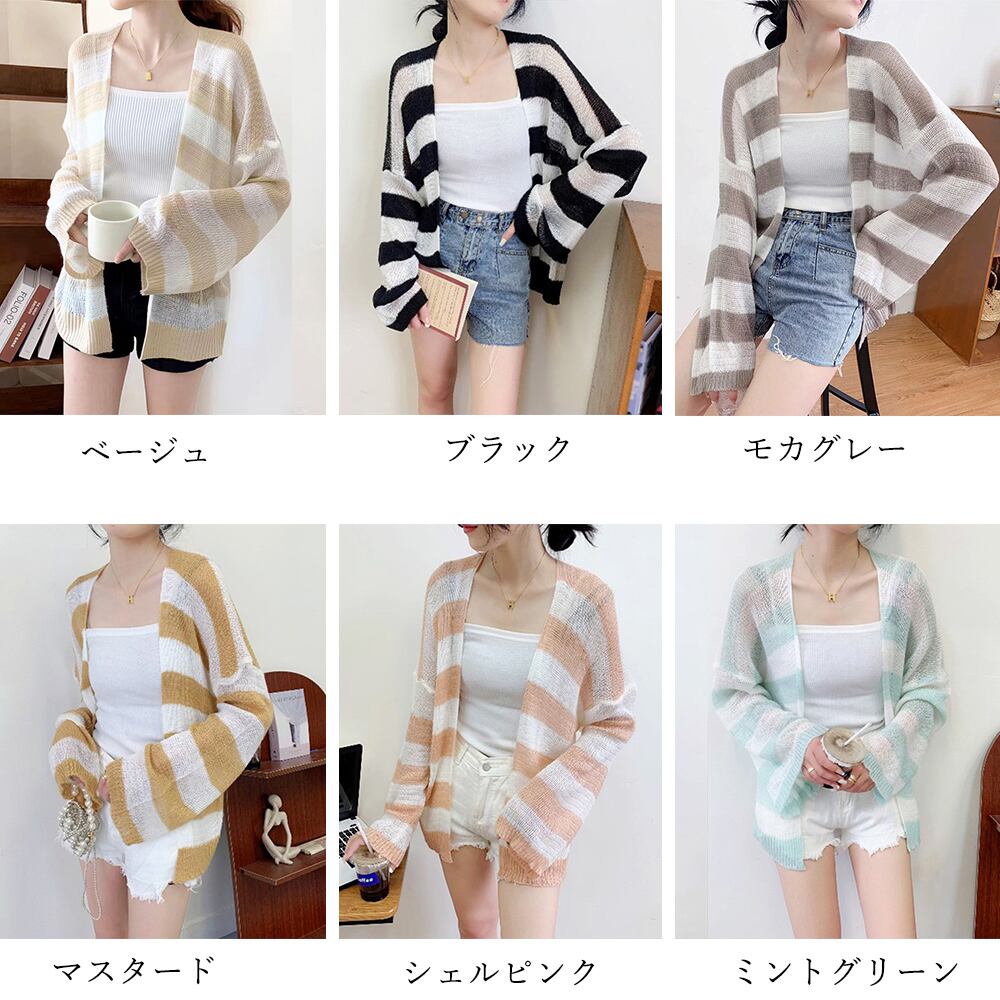 ニット羽織り 透け編み ボーダー柄ボレロカーデ サマーニットトップス バイカラー春夏秋カジュアル ライトアウター冷房対策