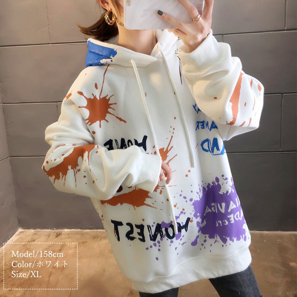ペイント柄 フード付き パーカー レディース 裏起毛 長袖トレーナー 秋冬