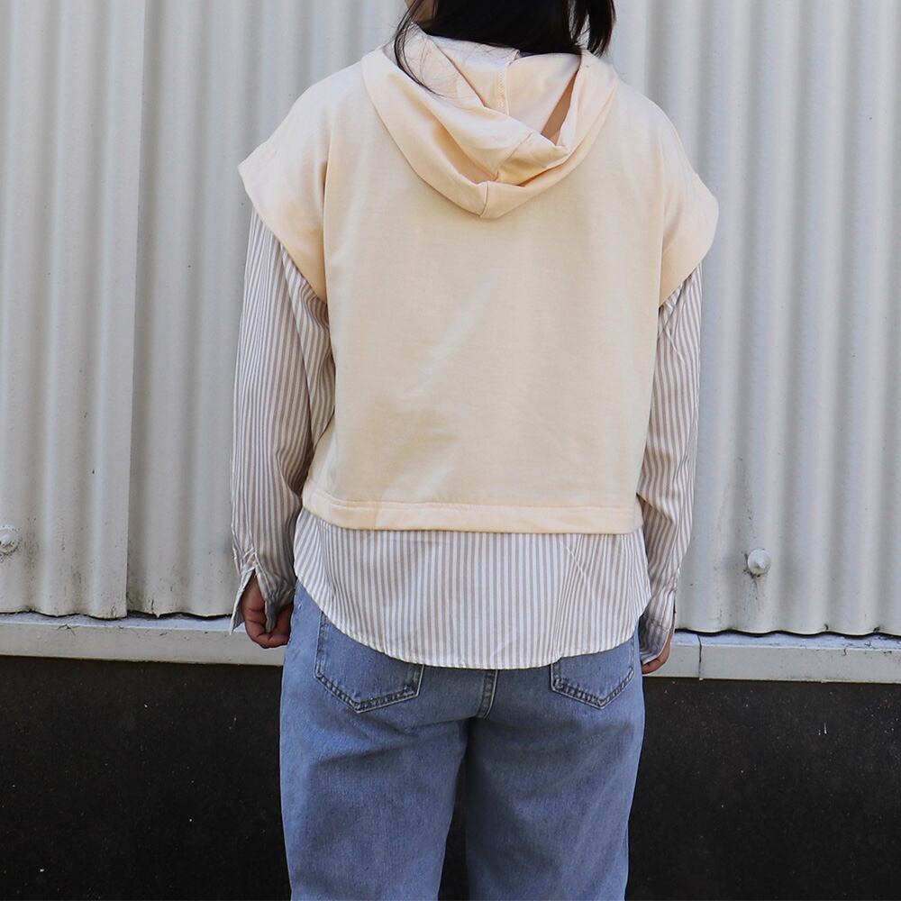 パーカーカットソーとストライプ柄のシャツを重ね着したドッキングプルオーバー