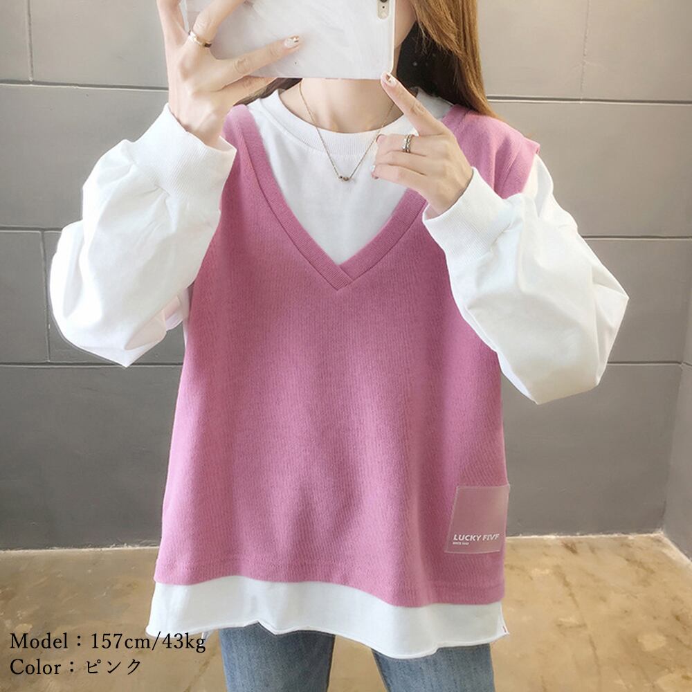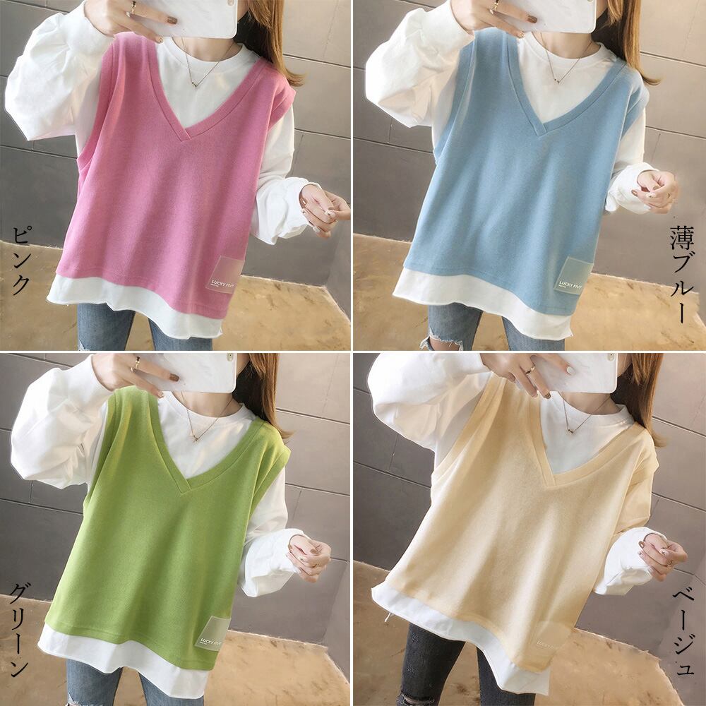 ドッキングトップス 秋服無地着やせ配色 ニットジレ 異素材