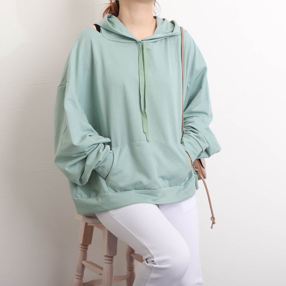 スウェットトレーナー 薄手長袖 肩出し フーディー ボリューム袖 カジュアル トップス 無地 プルオーバー 春秋通学