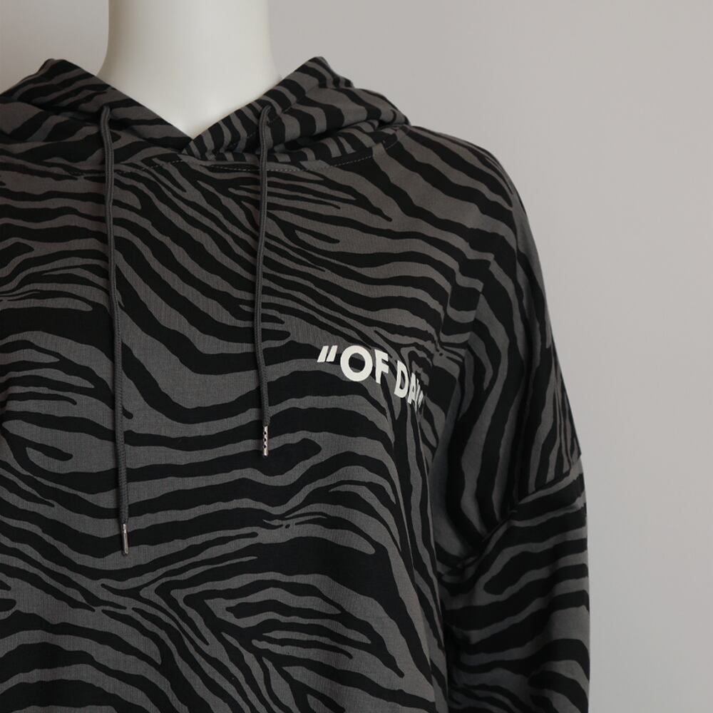 ゼブラ柄デザインが目を惹く存在感、胸元のロゴがワンポイントになります