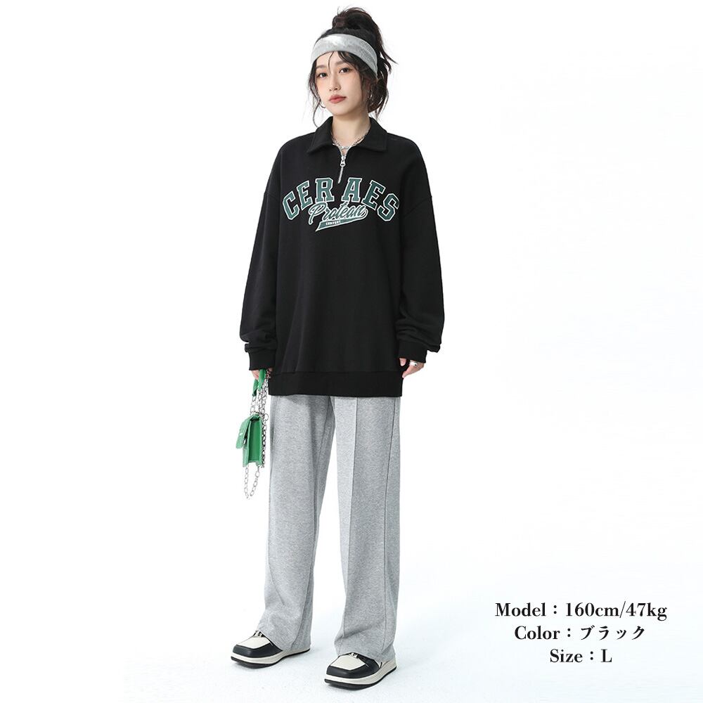韓国 ハーフジップ 長袖トップス ボリューム 英字ロゴ 春秋冬 プルオーバー ルームウエア カジュアル おしゃれ 新作