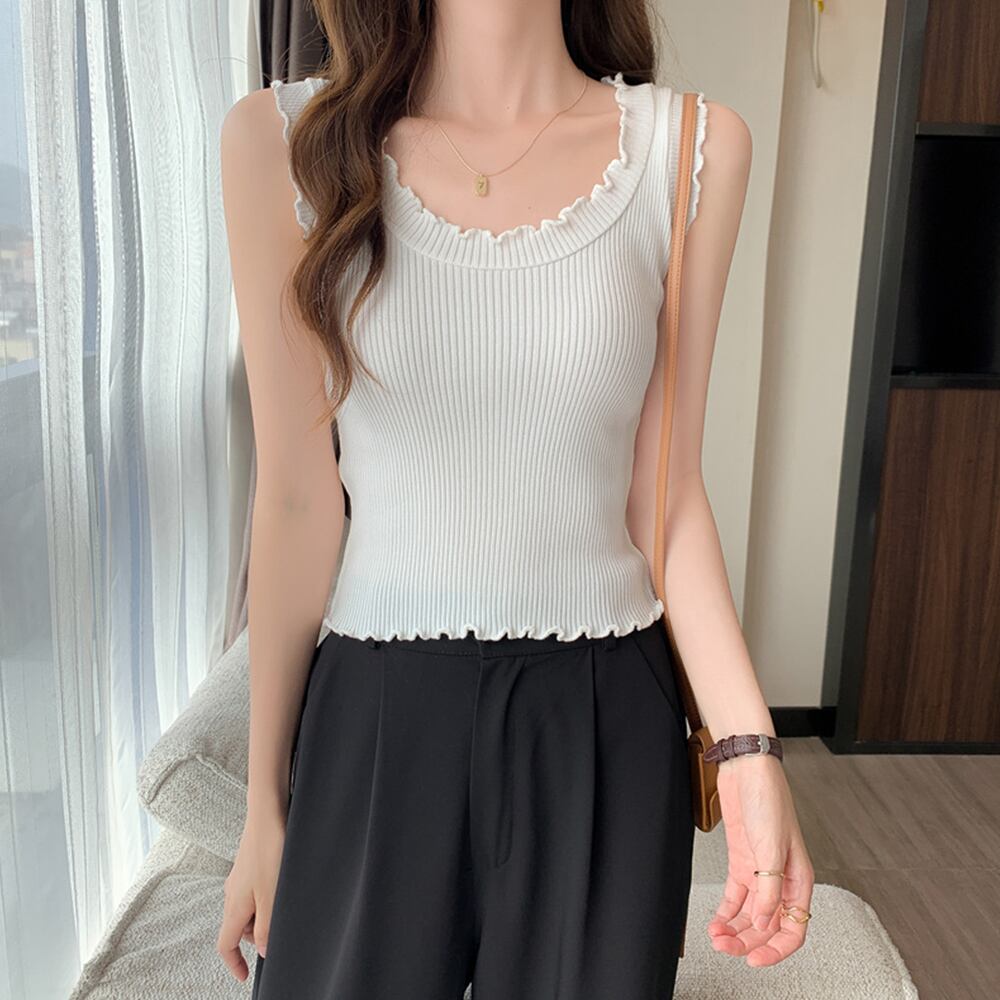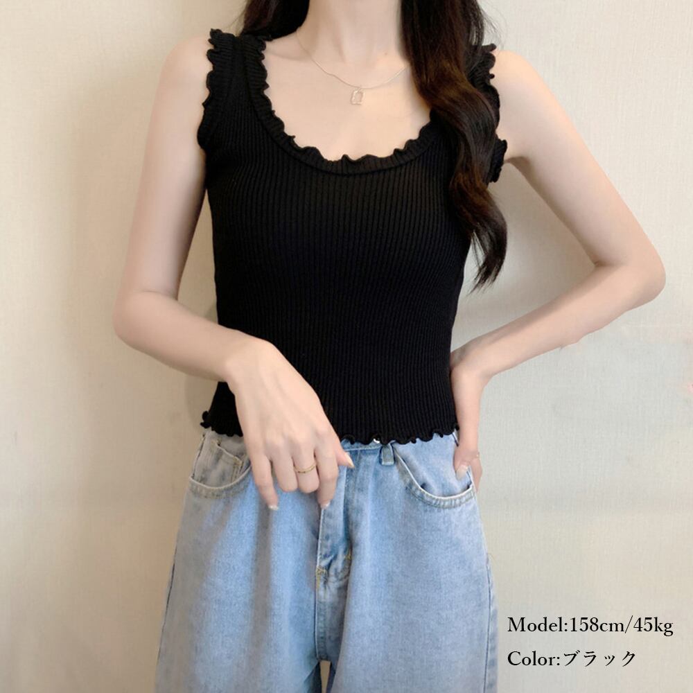 肩とネックラインにフリルデザイン、レディライクに仕上げたリブ仕様のニットタンクトップス