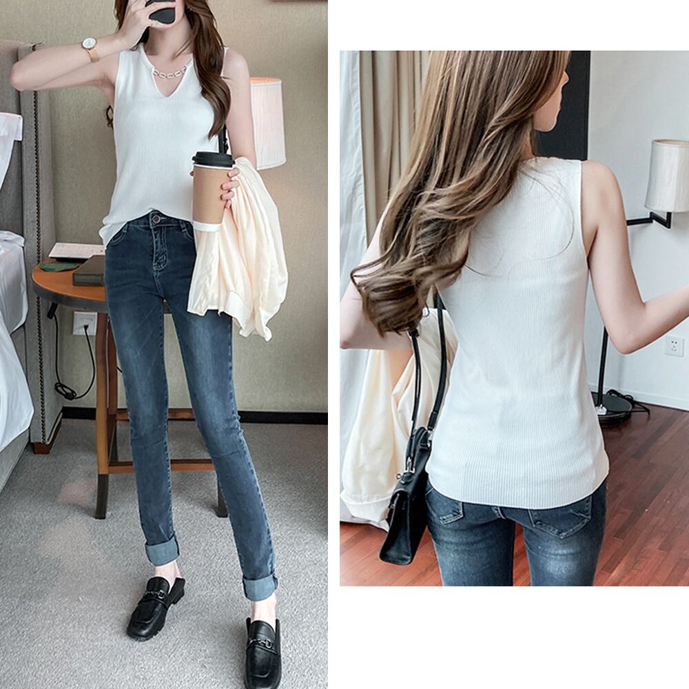 リブニット ノースリーブ トップス アクセサリー付き おしゃれ 重ね着 韓国風 インナーデコルテ