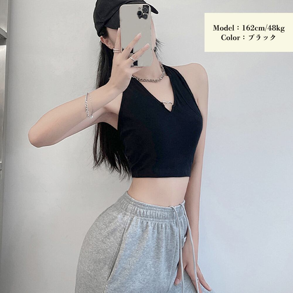 ホルターネックとハートチャームのデザインがおしゃれなタンクトップで、1枚での着用はもちろん、インナータンクトップとしても活躍します。