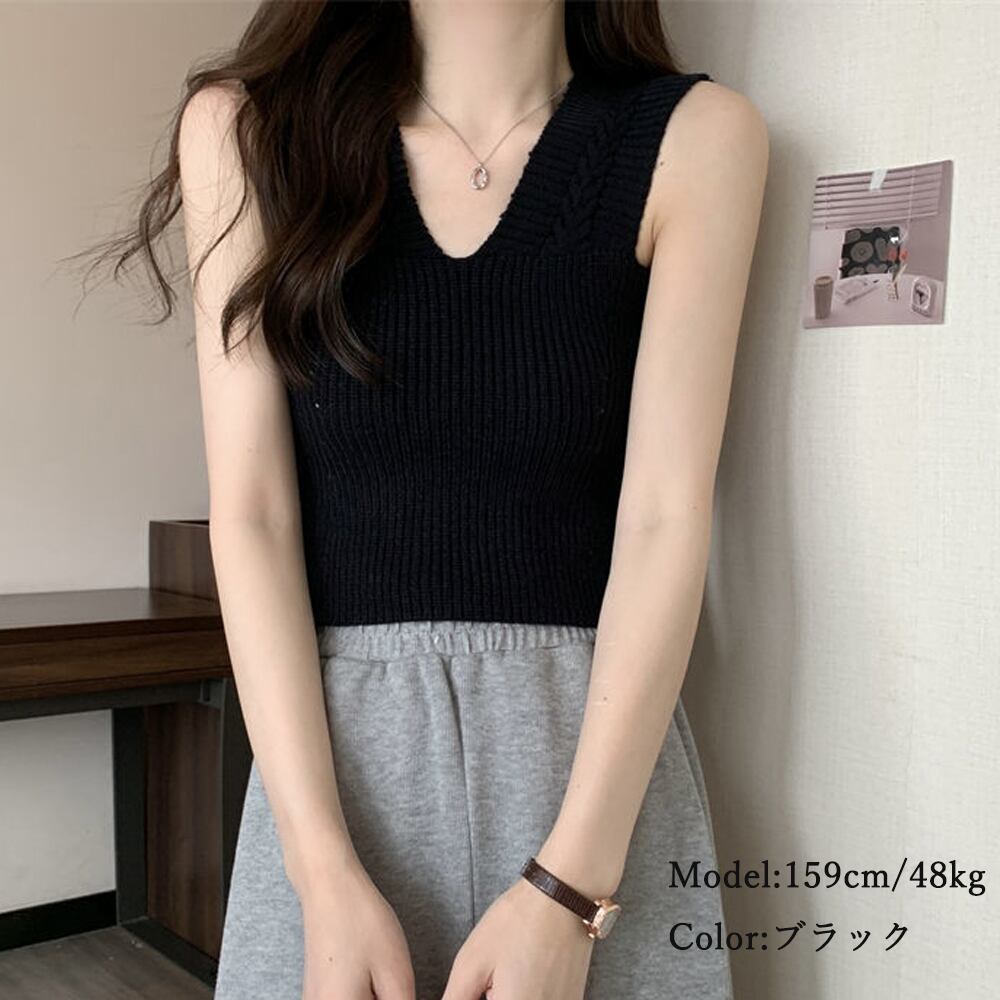 レディース ノースリーブ ショート丈トップス Vネック 重ね着 リブニット 韓国ファッション ニットベスト 通勤通学