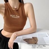 胸元には英字ロゴがコーデのアクセントに、肌見せコーデには欠かせないタンクトップ