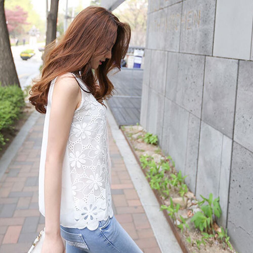 フロントのレースとシフォンを重ねたノースリーブタンクトップ。