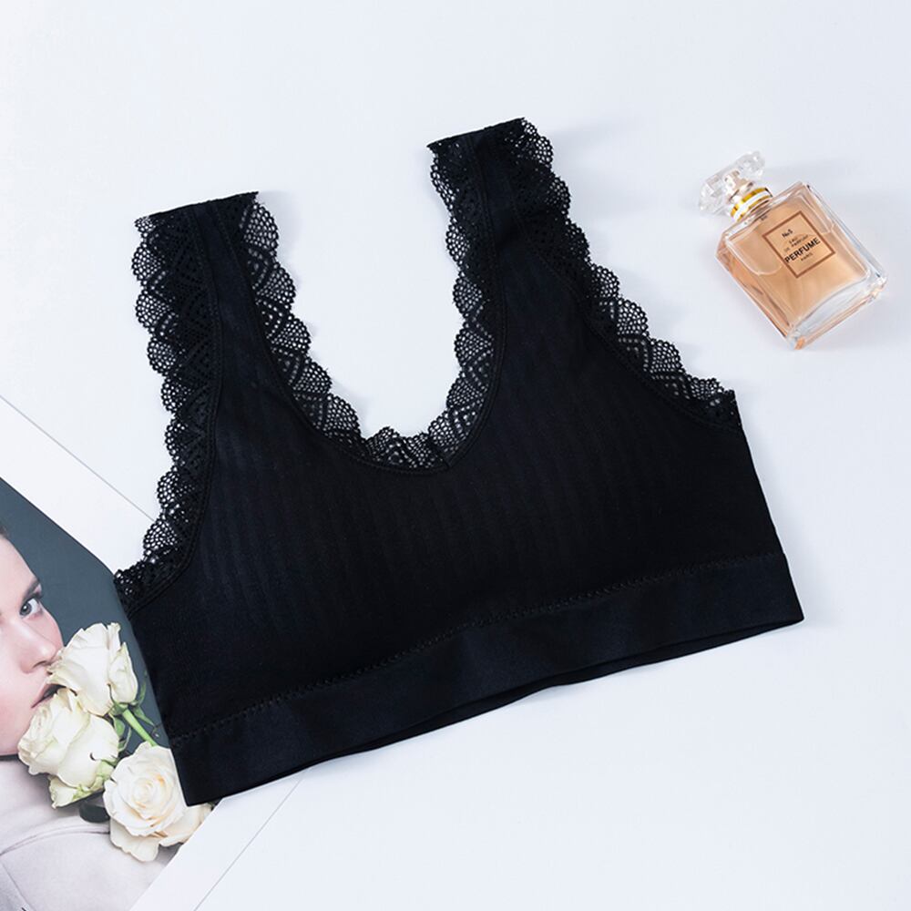 伸縮性に優れた生地と幅広のアンダーゴムで叶えた、柔らかなフィット感のノンワイヤーレースブラトップです