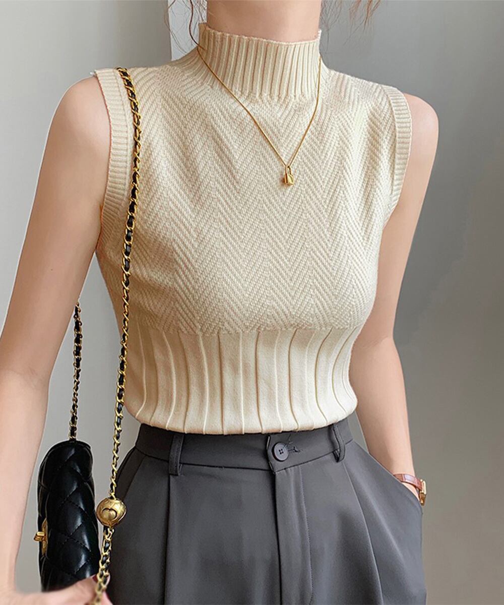 サマーニット レディース ニットタンクトップ プチハイネック シンプル 重ね着インナー ボトルネックニット 着やせ 無地