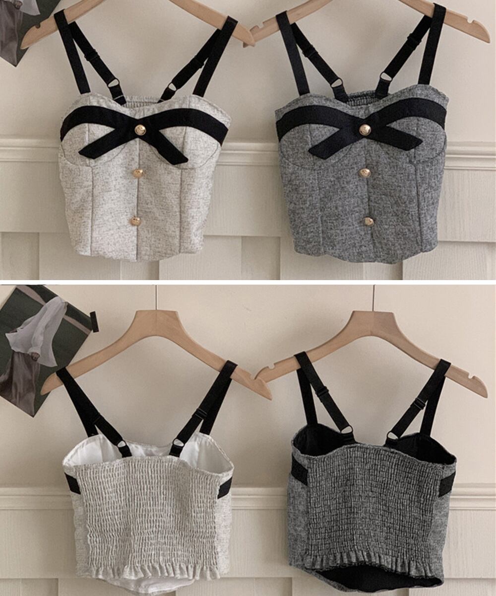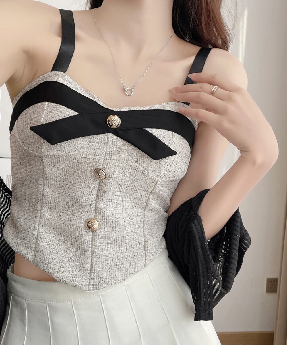 フロントボタン配色リボンキャミ 韓国風