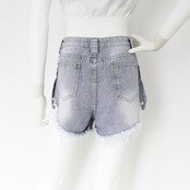 カットオフした裾のフリンジと大きめポケットが目を引きますデニムショートパンツ