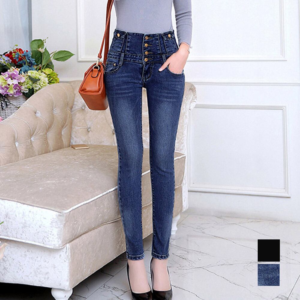 脚長、スタイルアップ抜群のハイウエストボタンスキニーデニムパンツ