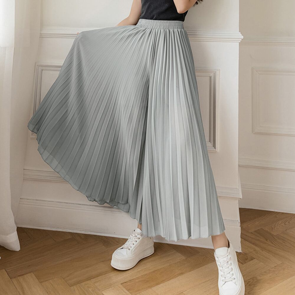 春先から秋まで長く着回せる、薄手のシフォンプリーツワイドパンツ