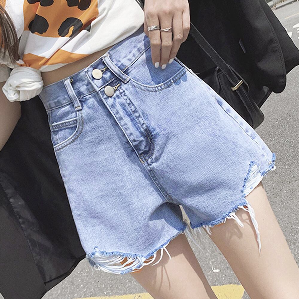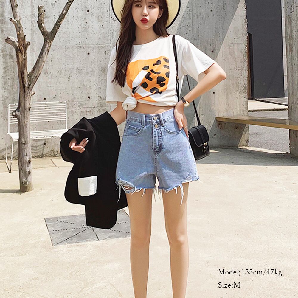 ハイウエスト ダメージ入り 着やせ パンツ ホットパンツ ボトムス ポケット ショートデニム