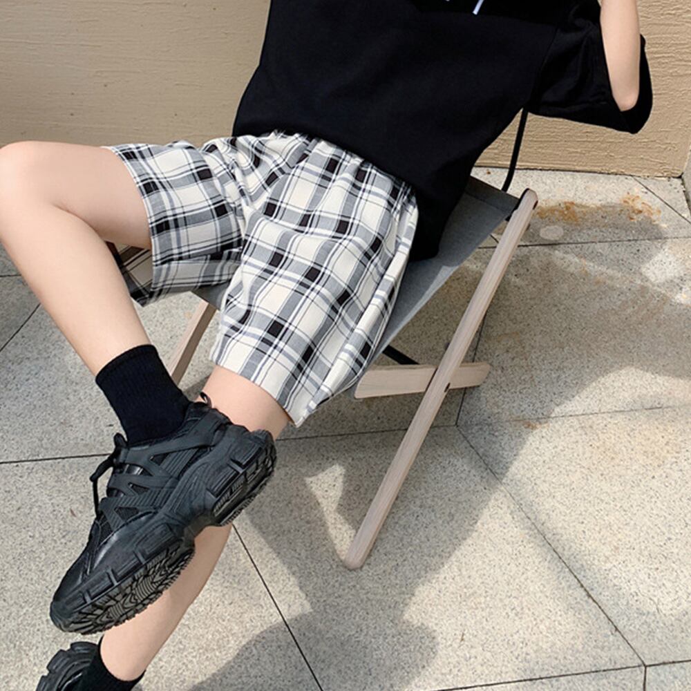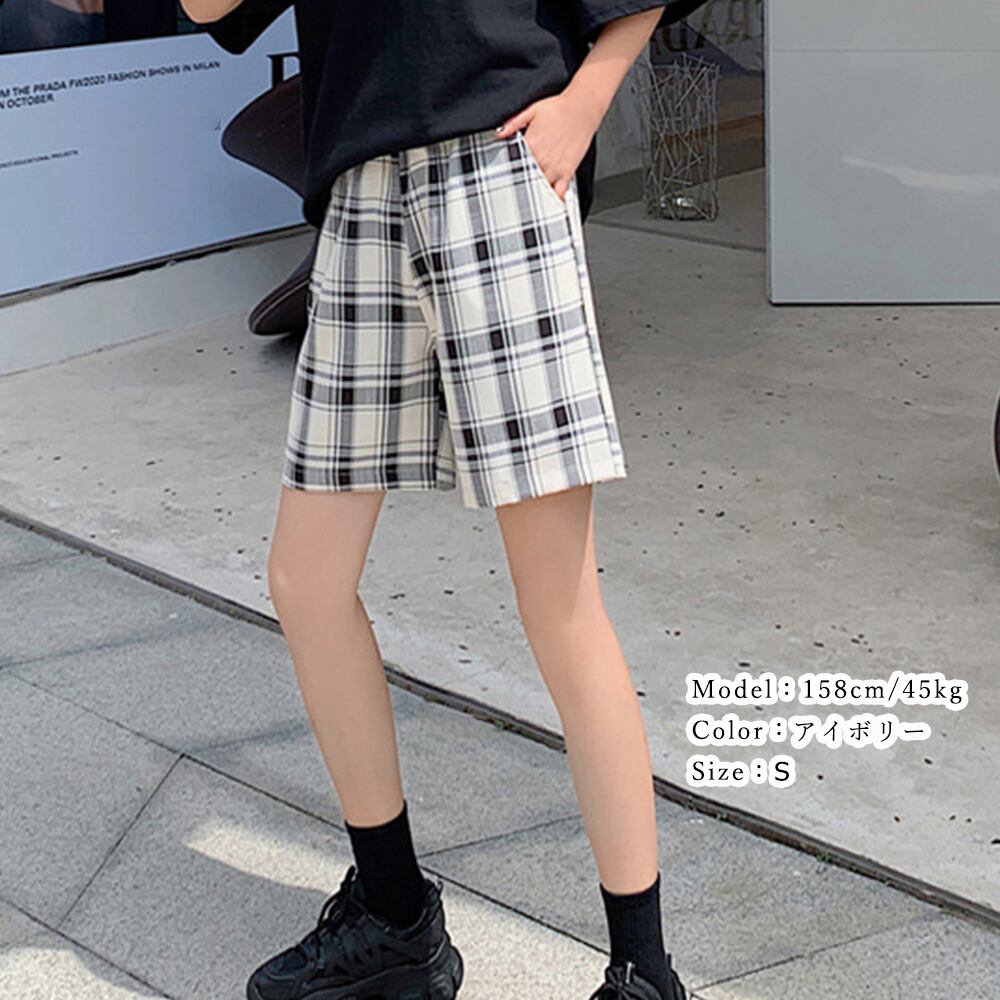 春 短パン チェック柄 ゆったり ハイウエスト 韓国ファッション カジュアル ストレートパンツ