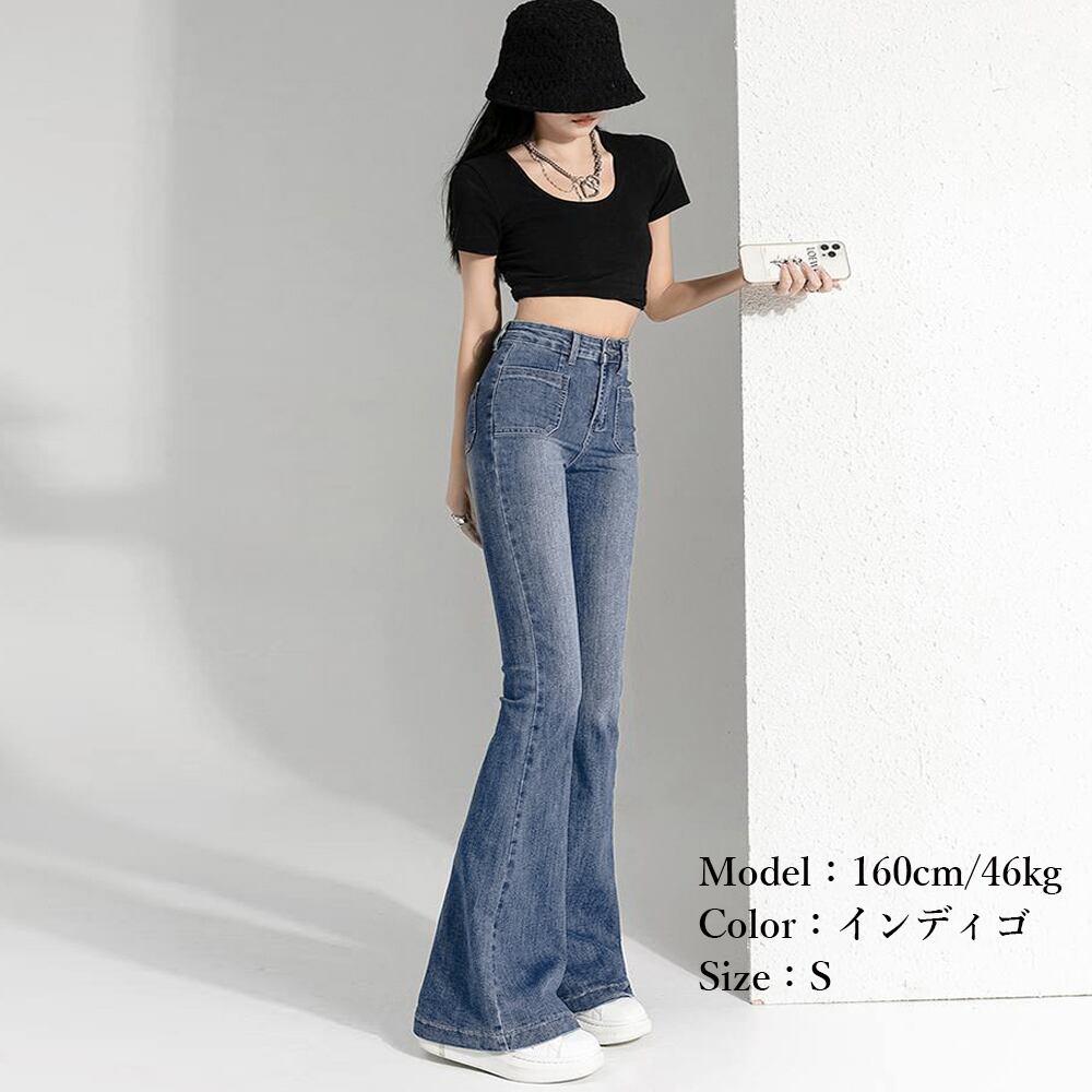 ストレッチパンツ レディース ハイウエスト パッチポケット ブーツカットパンツ カジュアルジーパン アメカジパンツ着やせ