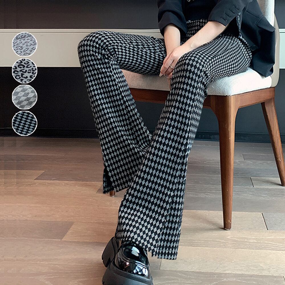 レディースボトムス ヒョウ柄 アーガイル柄 ハイウエスト ロングパンツ ウエストゴム おしゃれ 脚長 厚手ダイヤ柄パンツ