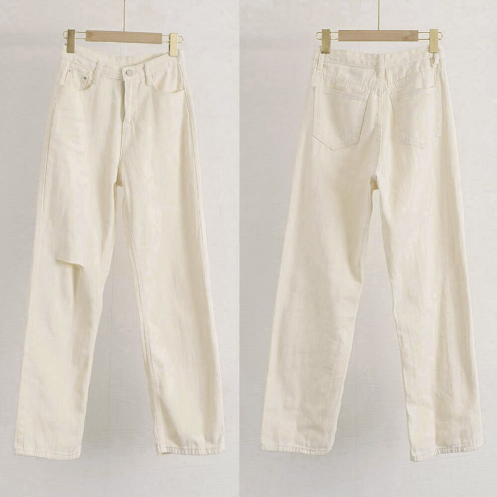 膝あたり程よいダメージ加工が施されており、トレンド感があふれる