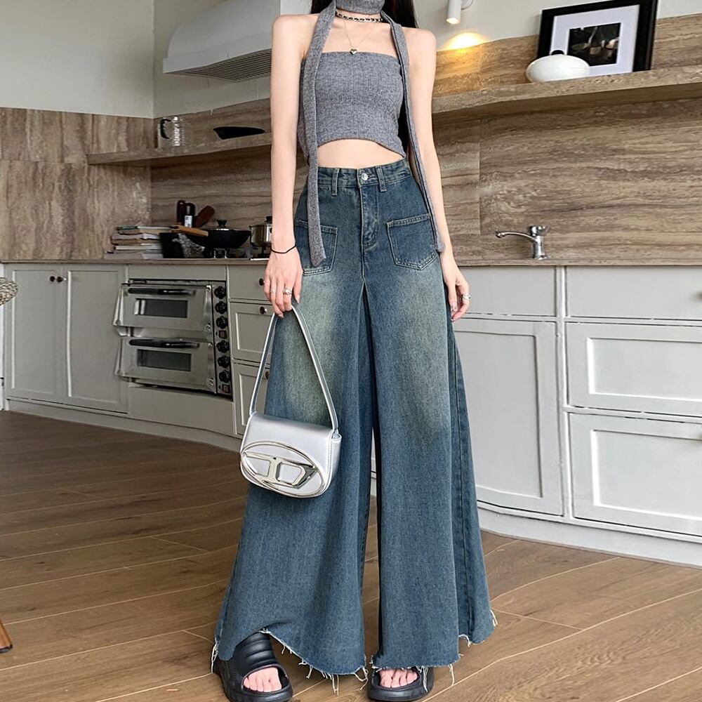 ウォッシュ加工ジーンズ カットオフバギーパンツ ハイウエストスカンツ レトロジーンズ 美脚脚長 ヘムフレアデニムお洒落