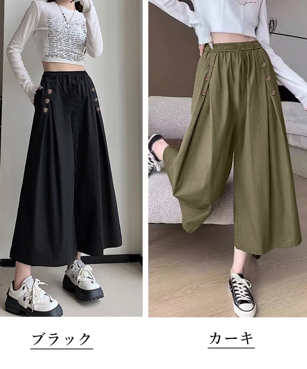 レディース ウエストゴム スカーチョ サイド飾りボタン付き スカンツ ゆったり ボトムス カジュアル ワイドガウチョ