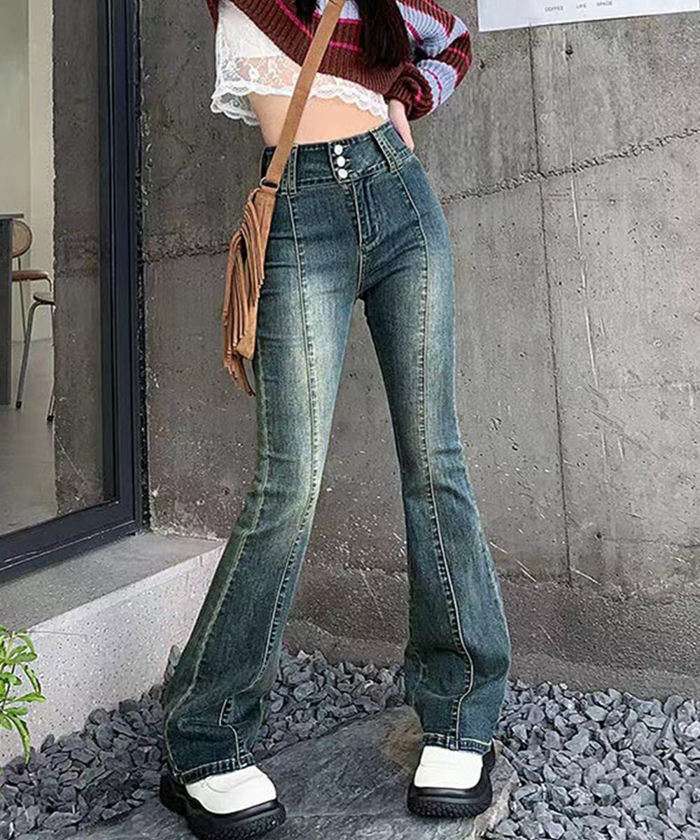 ジーパン ハイウエスト ヴィンテージパンツ 美脚脚長 ブーツカットデニム カジュアル 着やせ フロントラインロングパンツ
