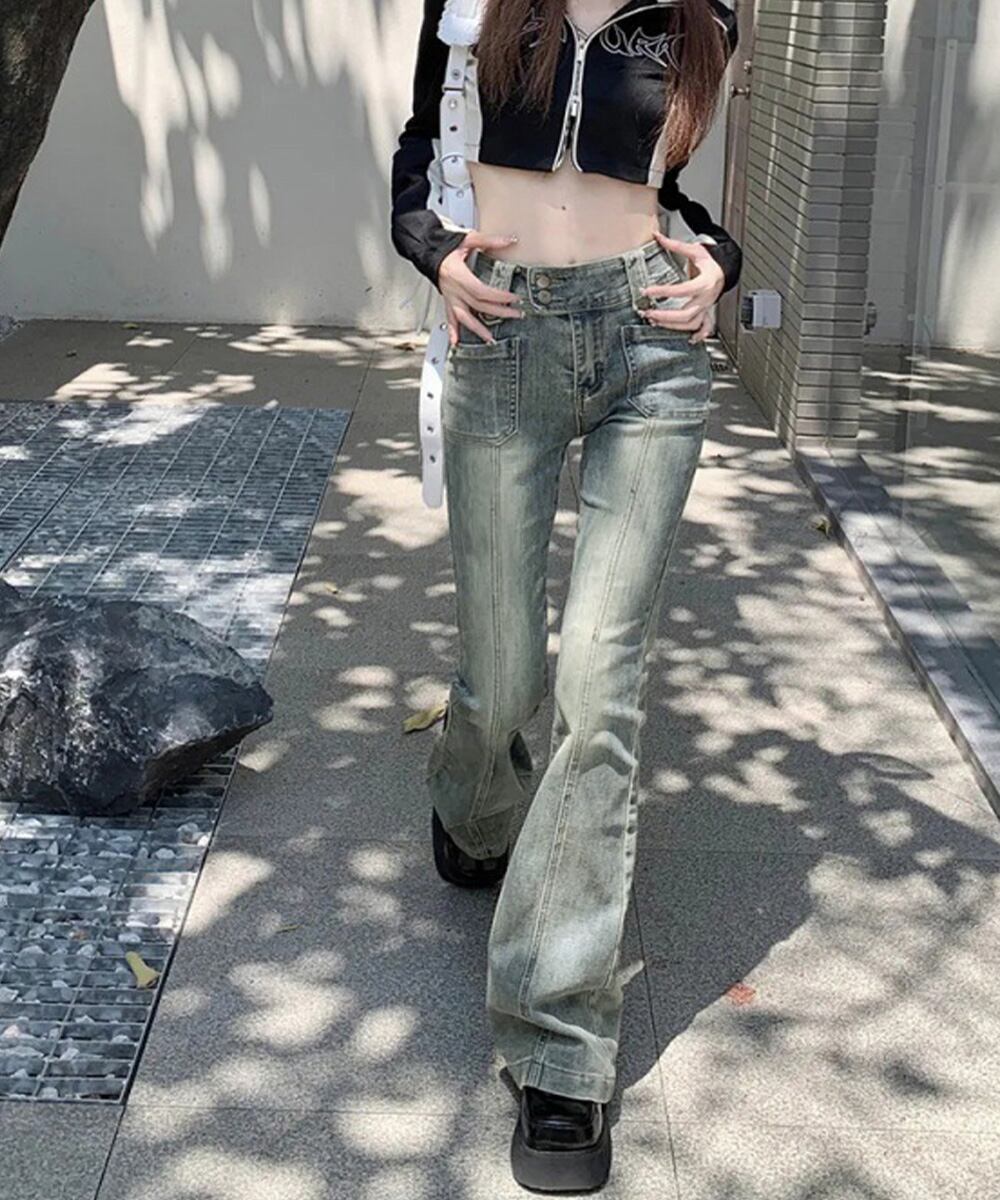 ウォッシュ加工が施され、独特の色合いと風合いが魅力のフレアデニムパンツ。